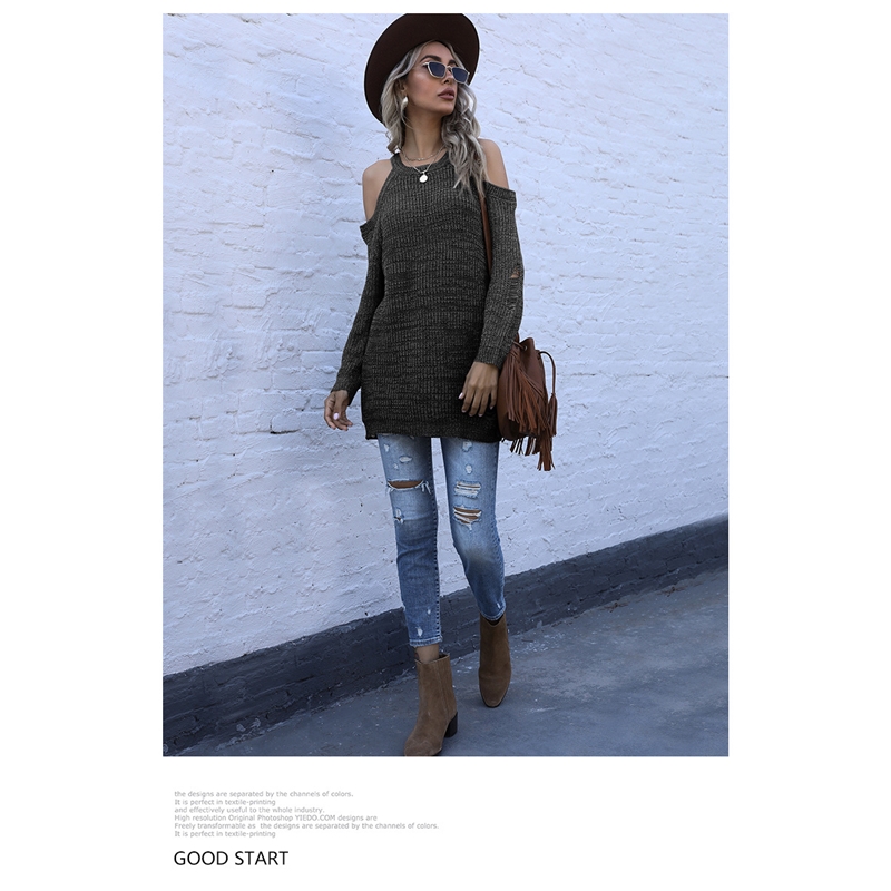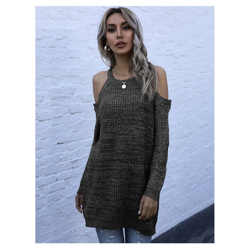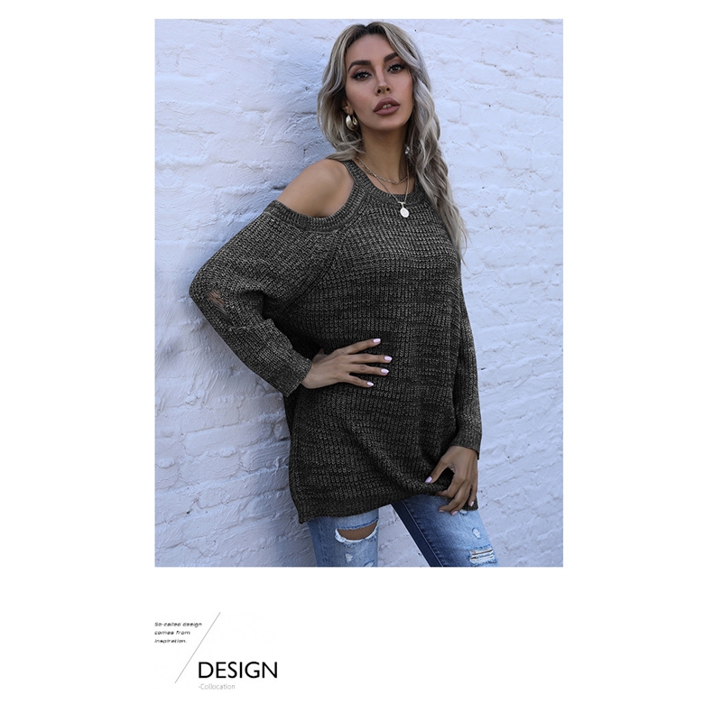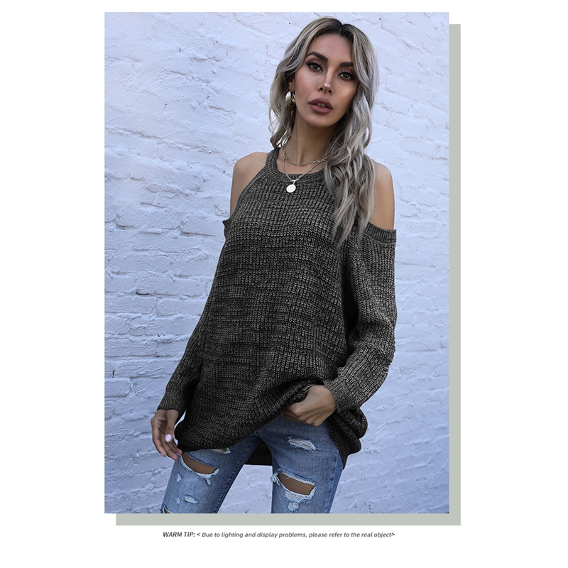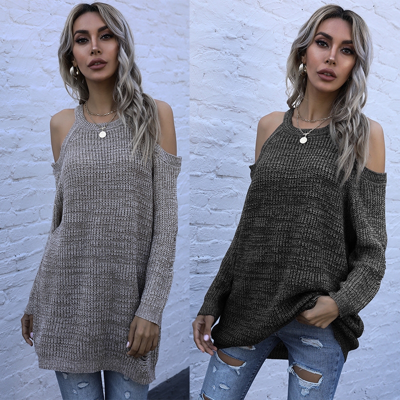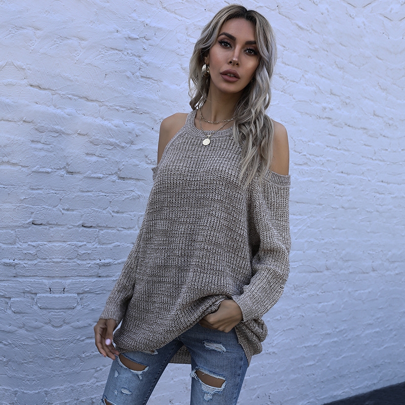 Solid Color Crewneck Off-Shoulder Knitted Sweater