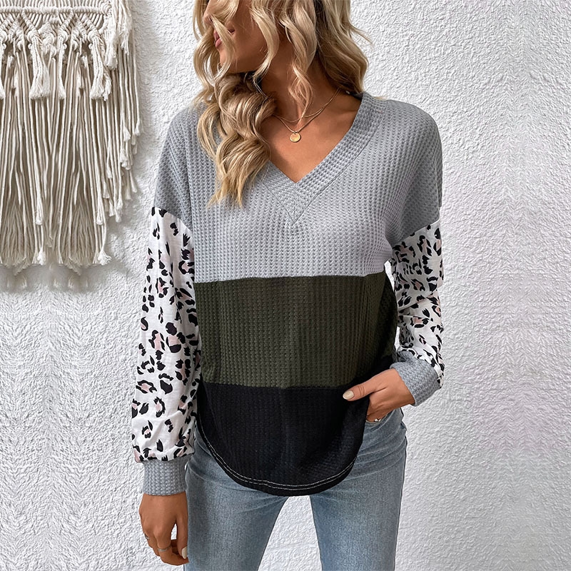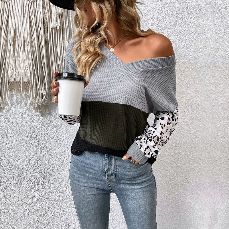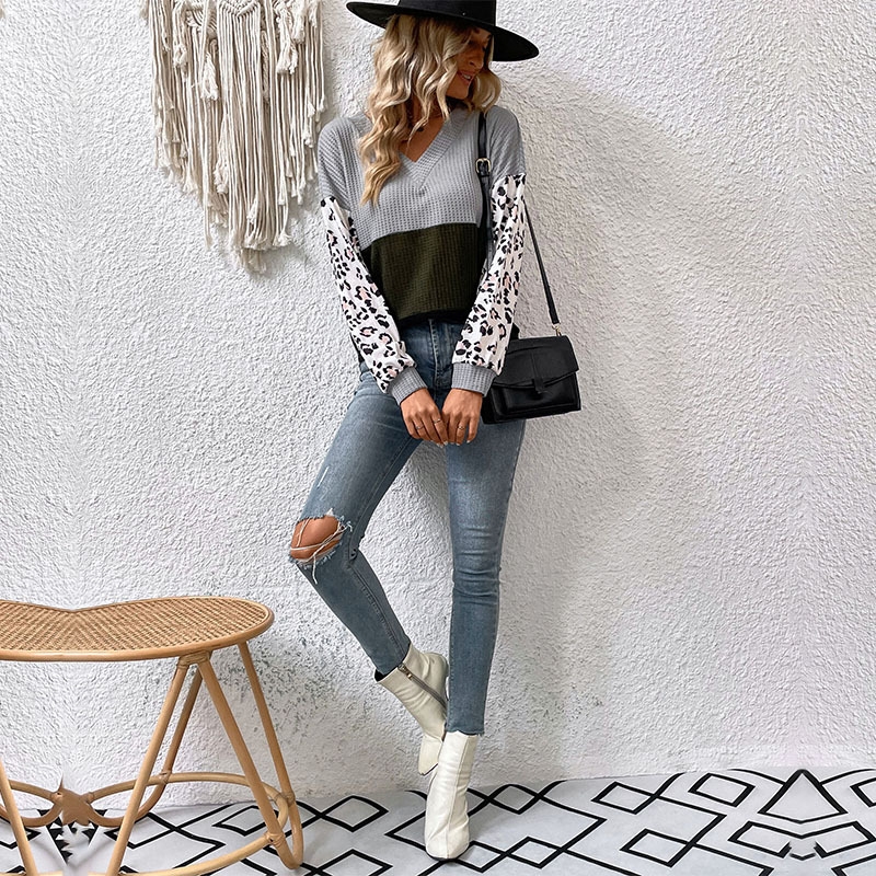 Loose Light Gray V-Neck Leopard Thin Sweater