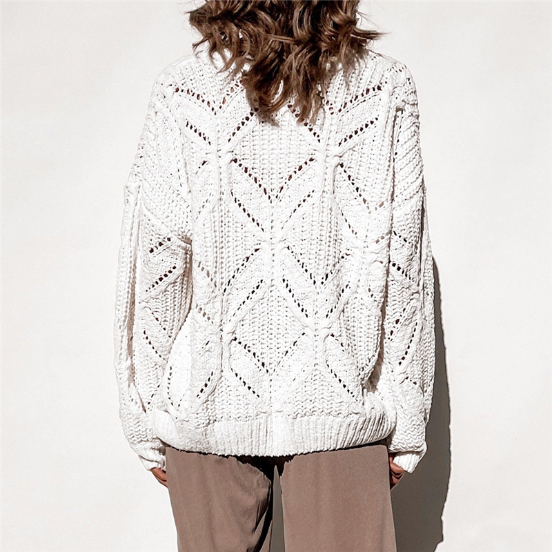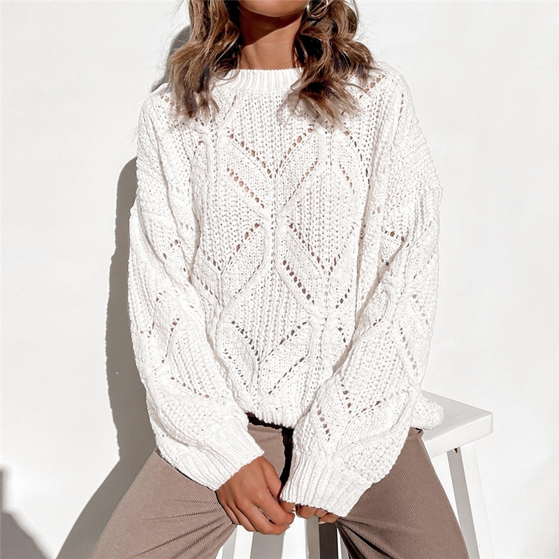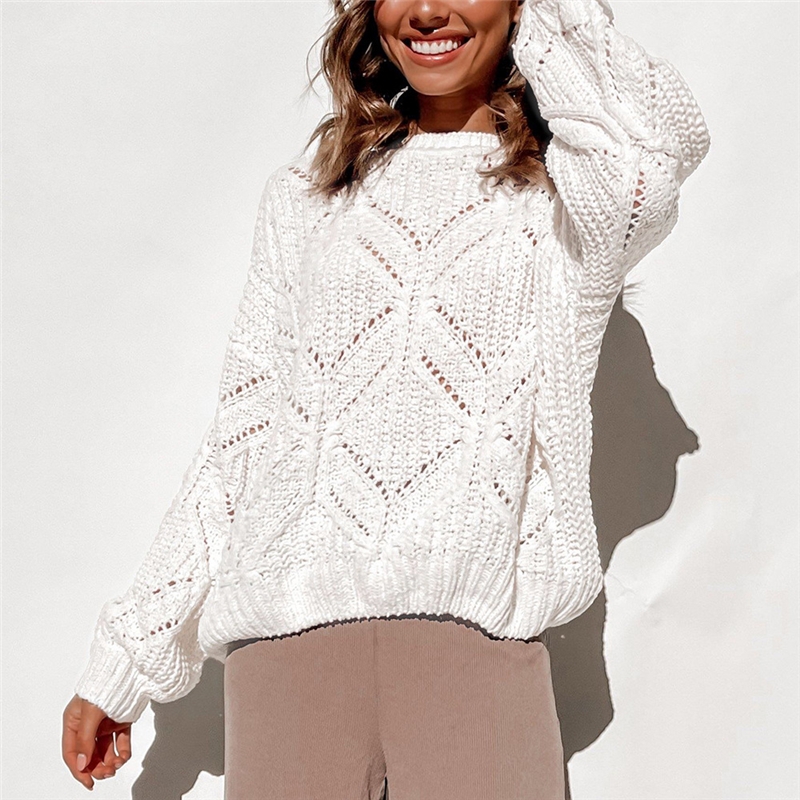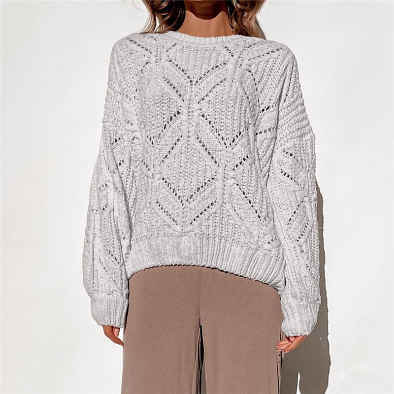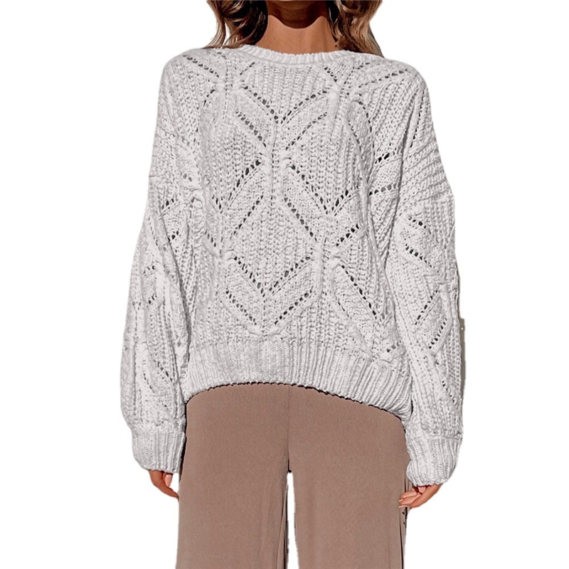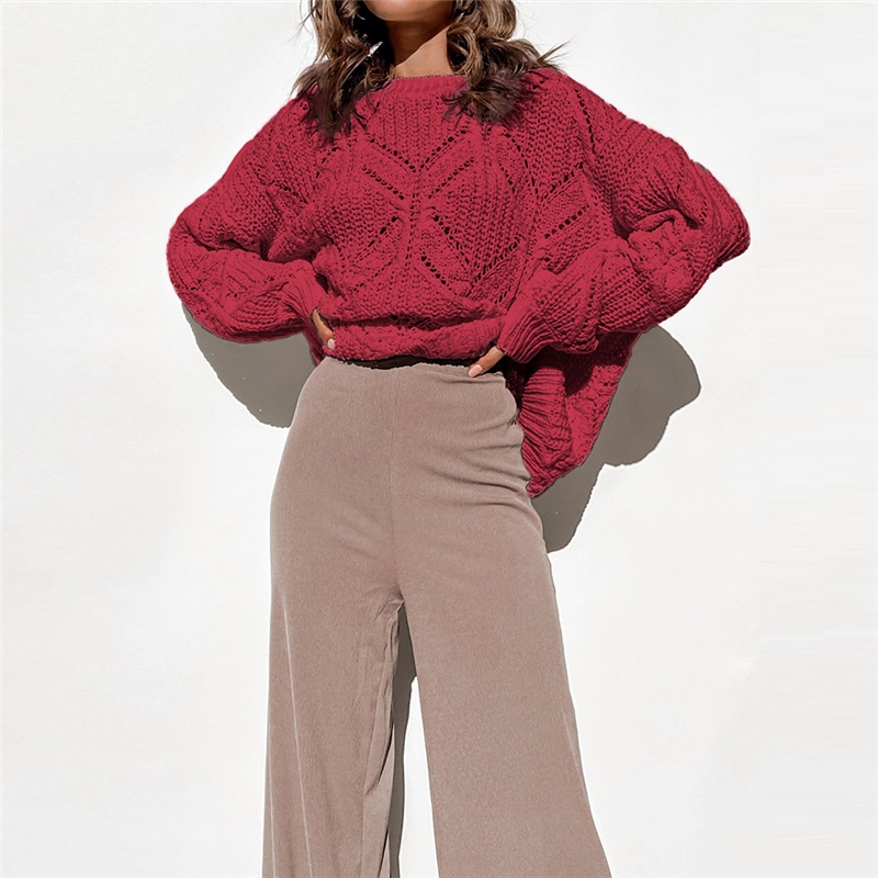 Solid Color Round Neck Lantern Sleeve Lazy Style Hollow Knit Sweater