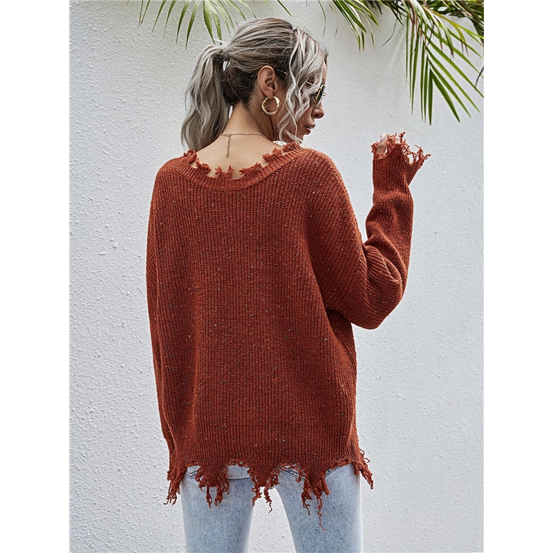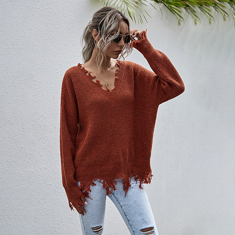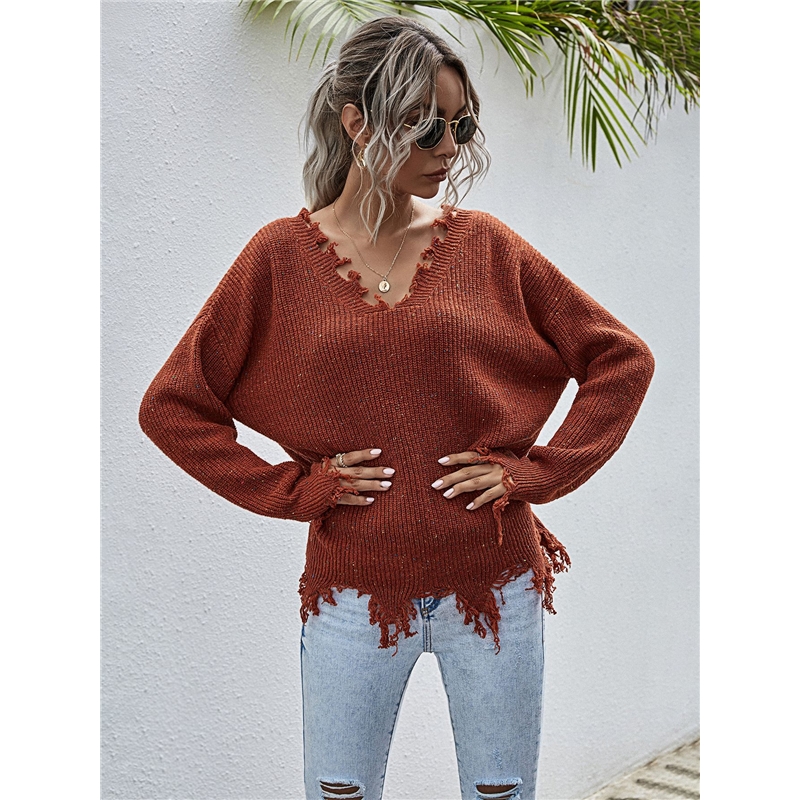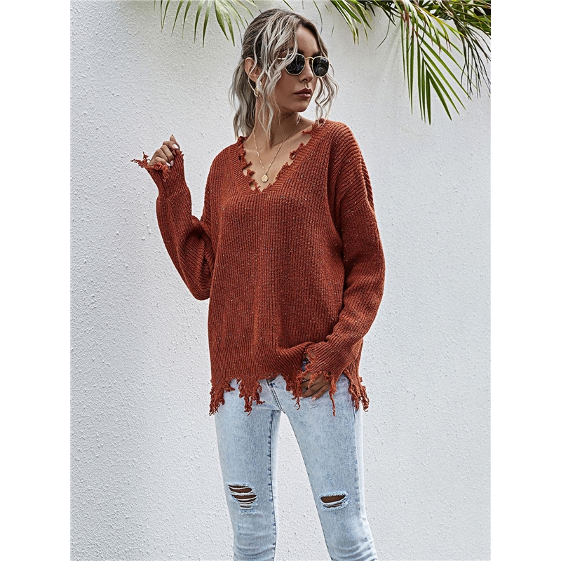 Long Sleeve V Neck Tasseled Solid Color Sweater