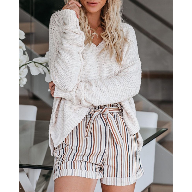 Long Sleeve V Neck Solid Color Split-Side Sweater
