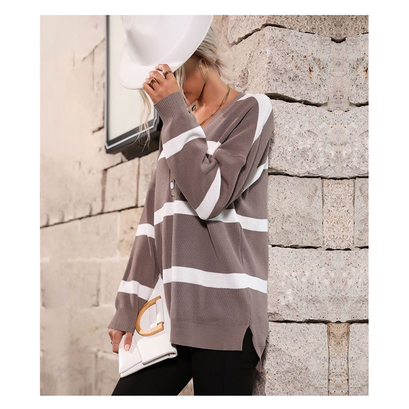 Brown Thin V-Neck Striped Buttoned Sweater