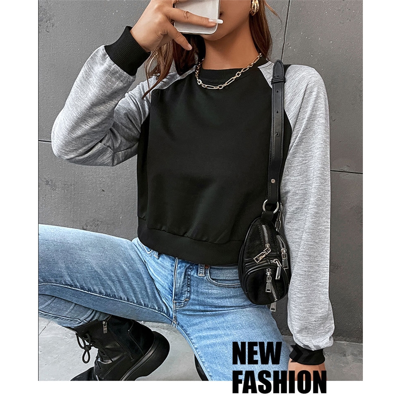 Contrast Color Cropped Round Neck Sweatshirt