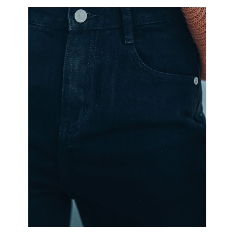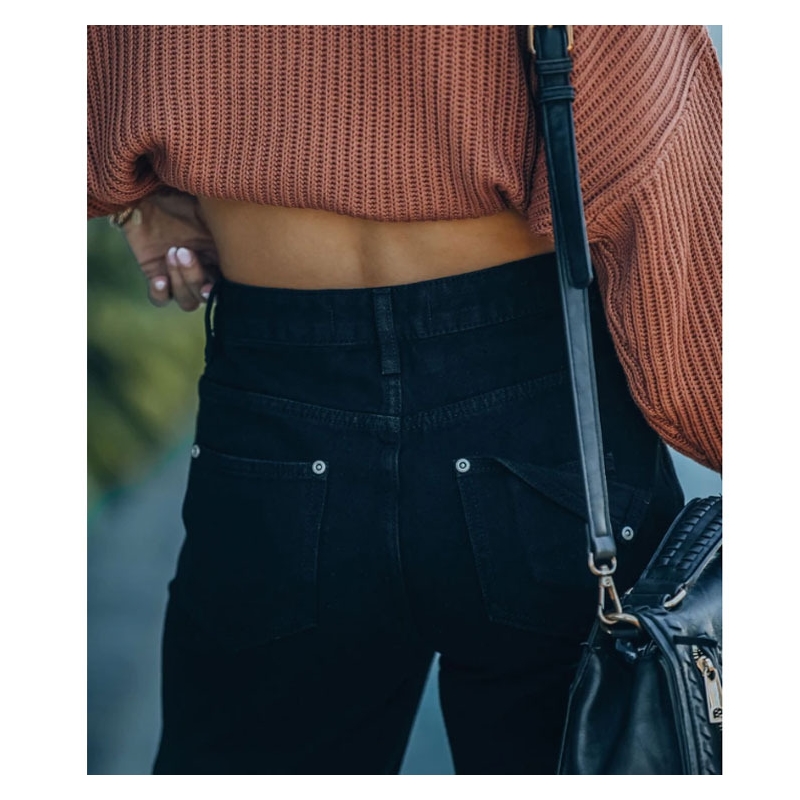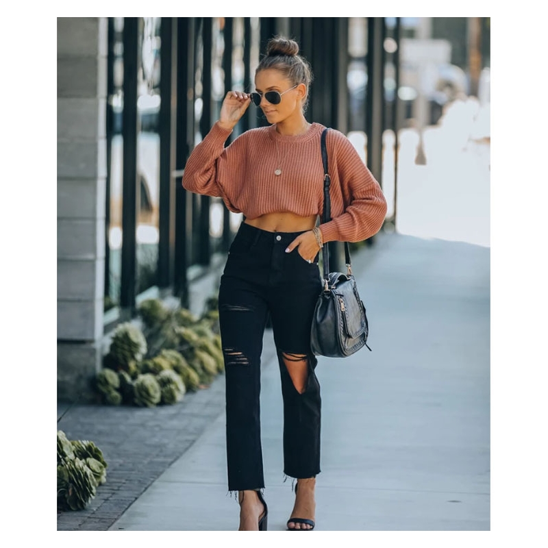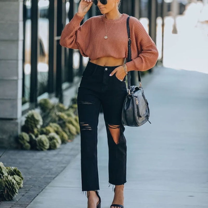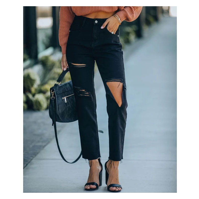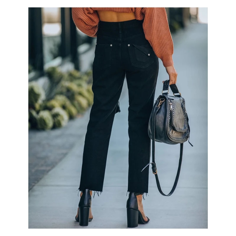 Solid Color Mid-Waisted Straight Leg Hole Jeans