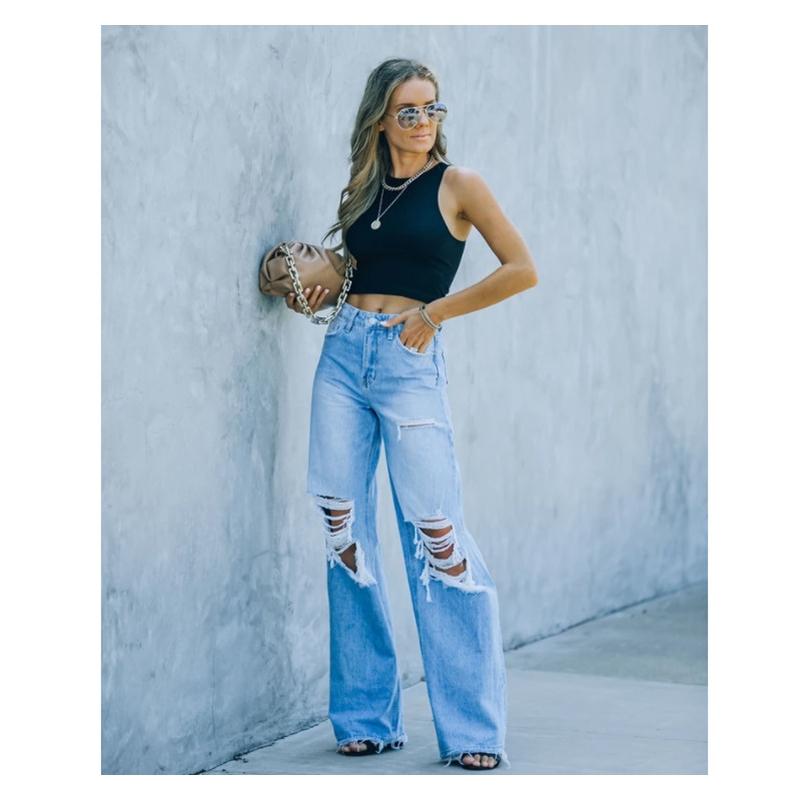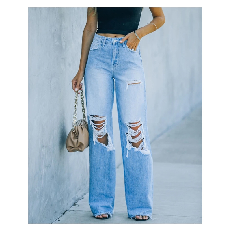 Mid-Waisted Straight Leg Hole Washed Jeans