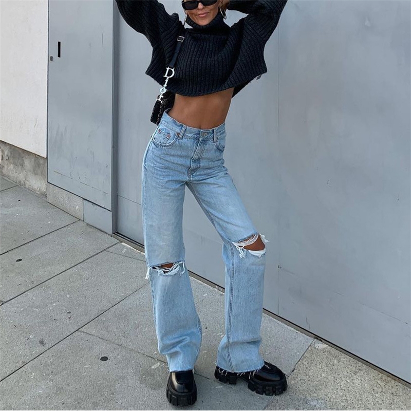 Solid Color Mid-Waisted Holes Straight Leg Jeans