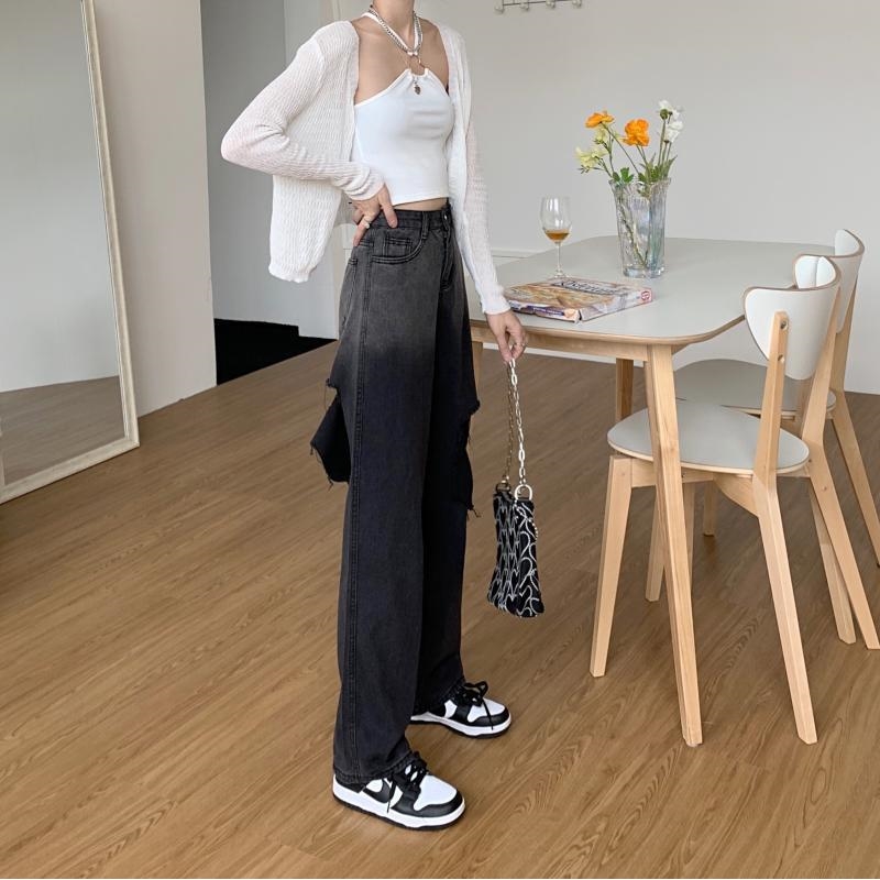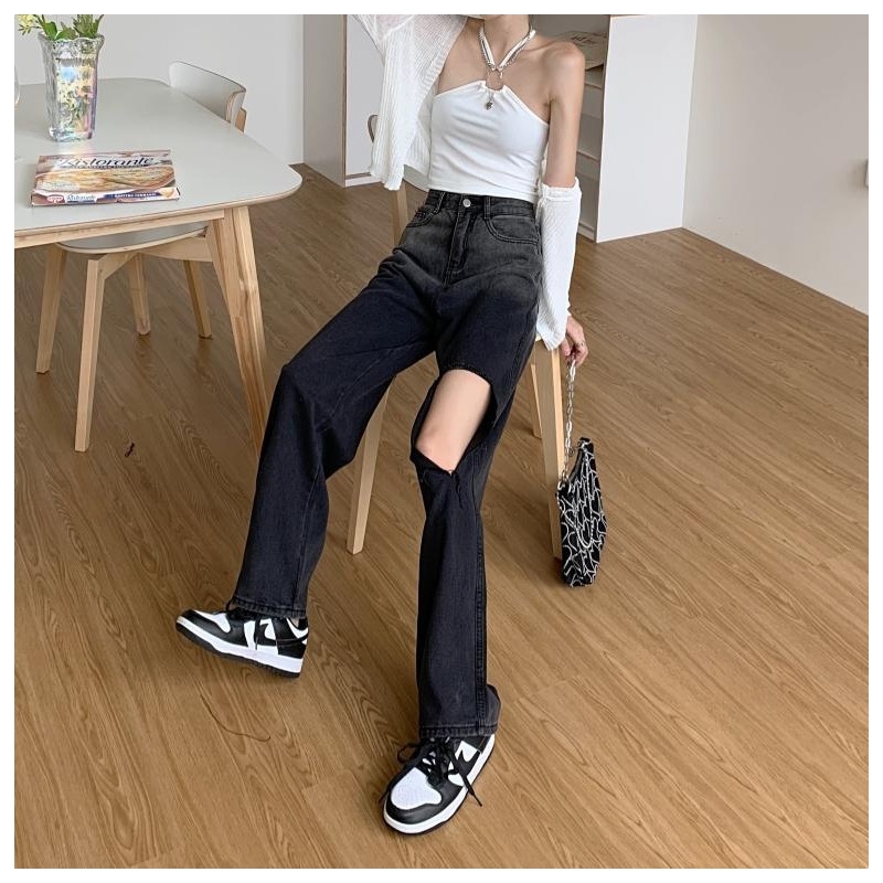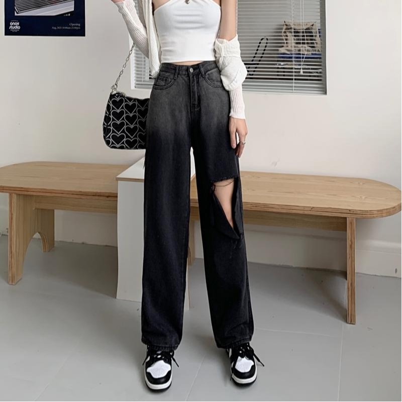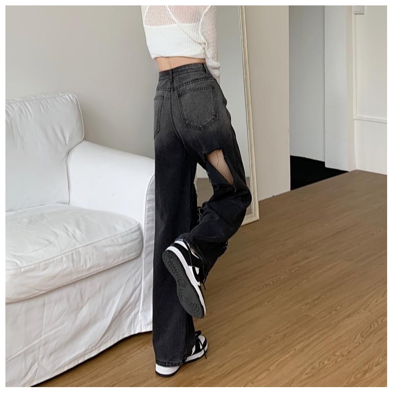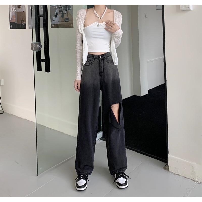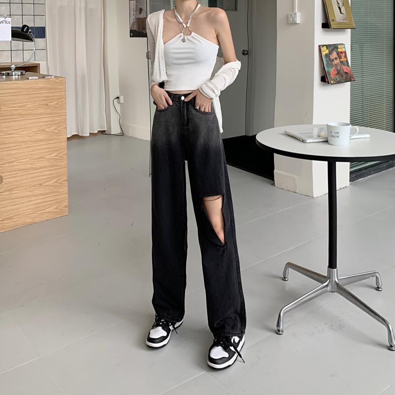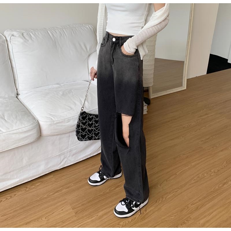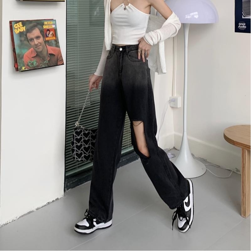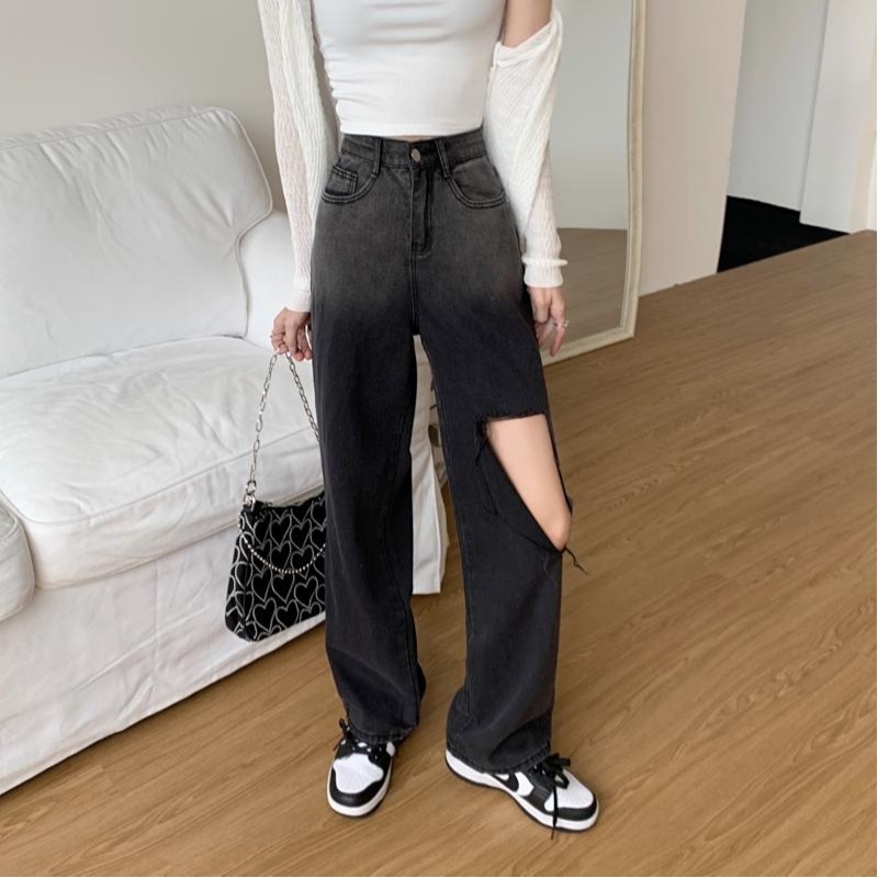 High Waisted Straight Wide Leg Gradient Color Hole Jeans
