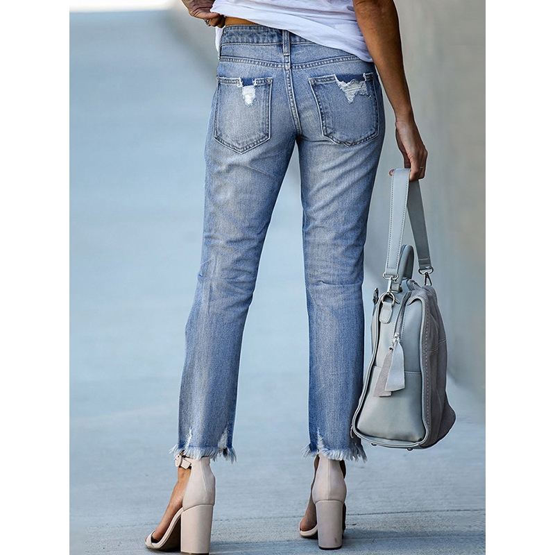 Fringed Hem Ripped Stretch Tapered Jeans