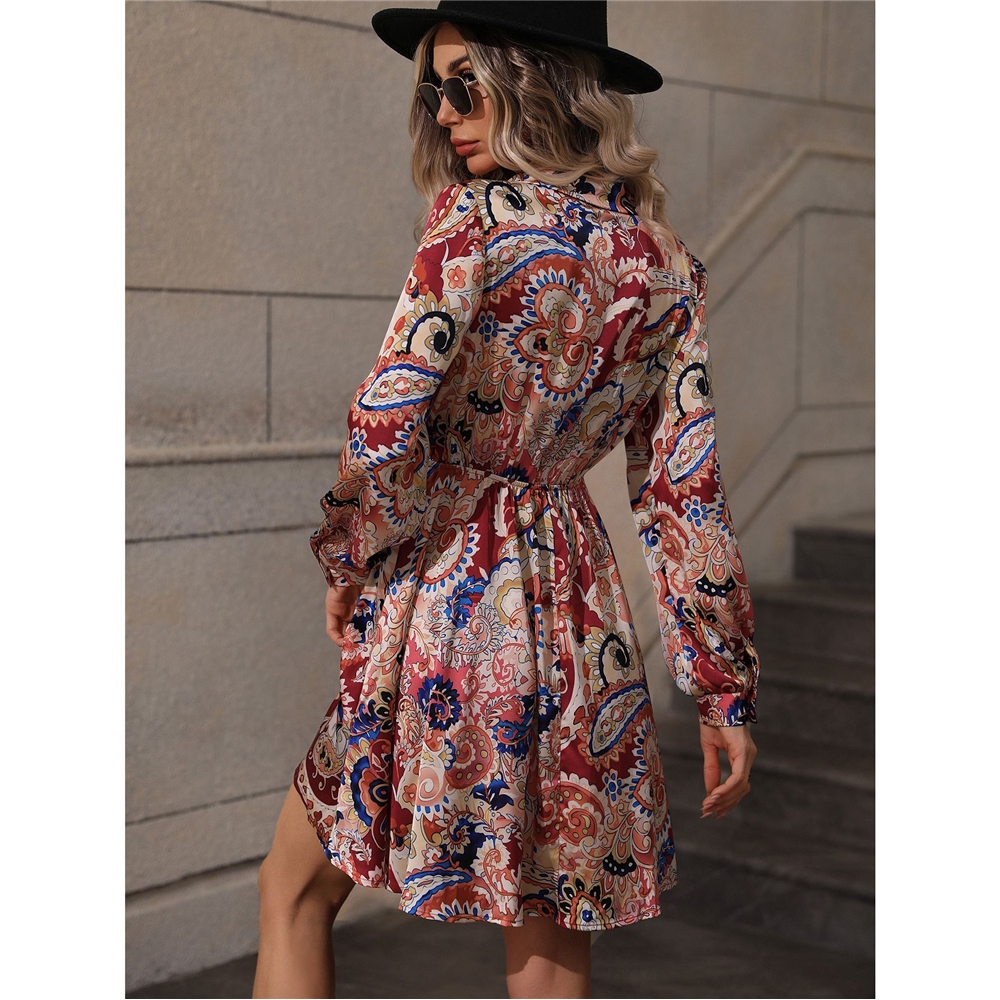V-Neck Long Sleeves Printing Elastic Waist Mini Dress