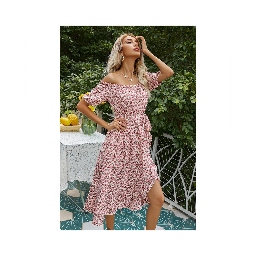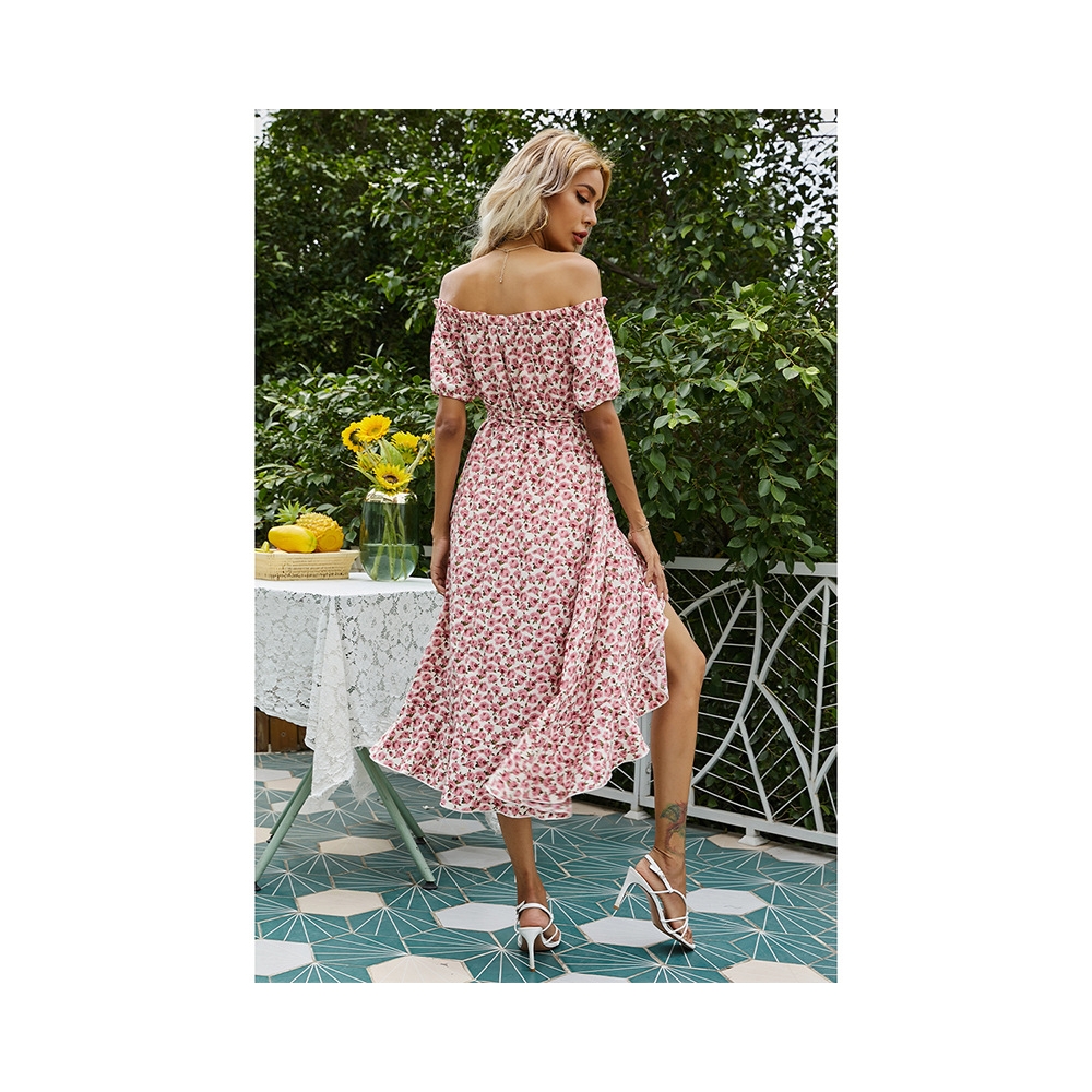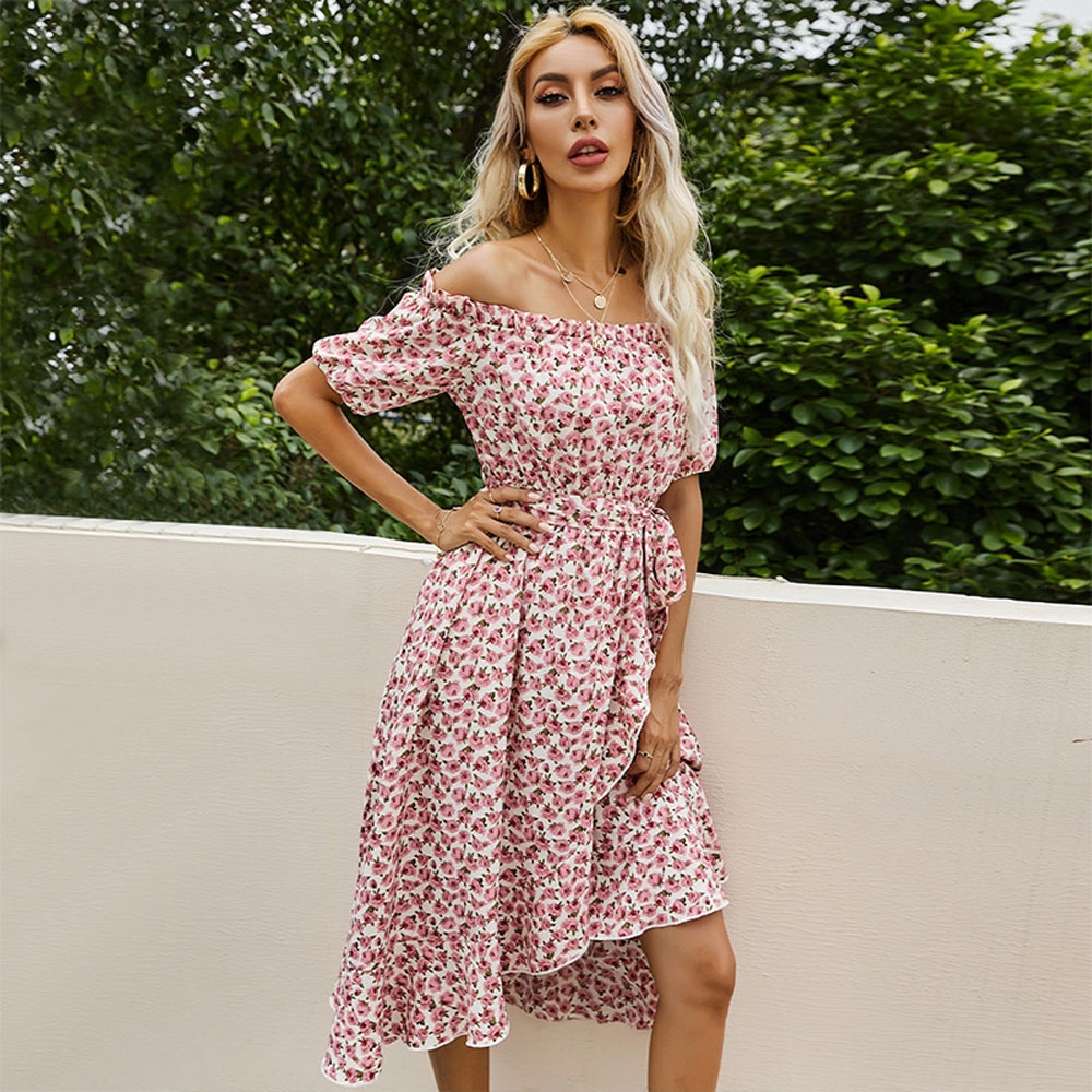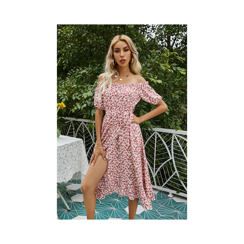 Short Sleeves Boat Neck Floral Printed Tied Slit Midi Dress