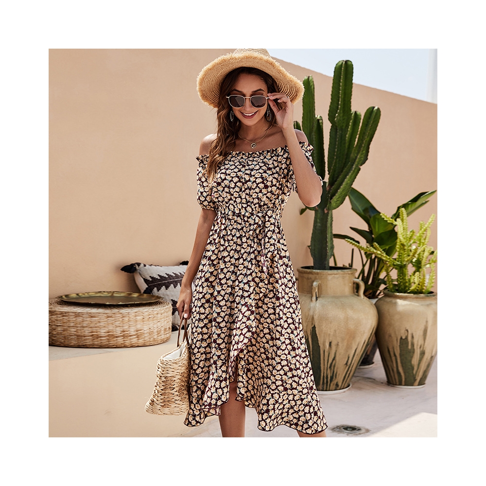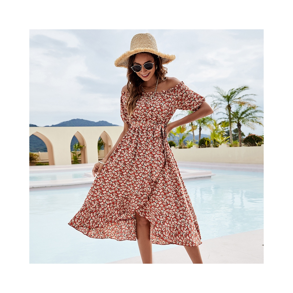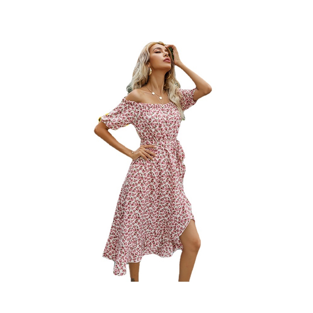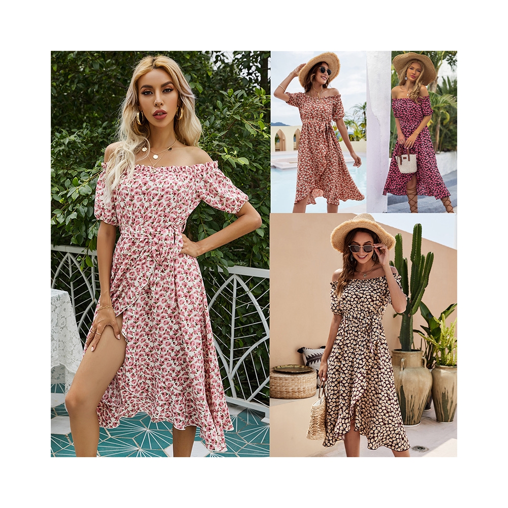 Short Sleeves Boat Neck Floral Printed Tied Slit Midi Dress