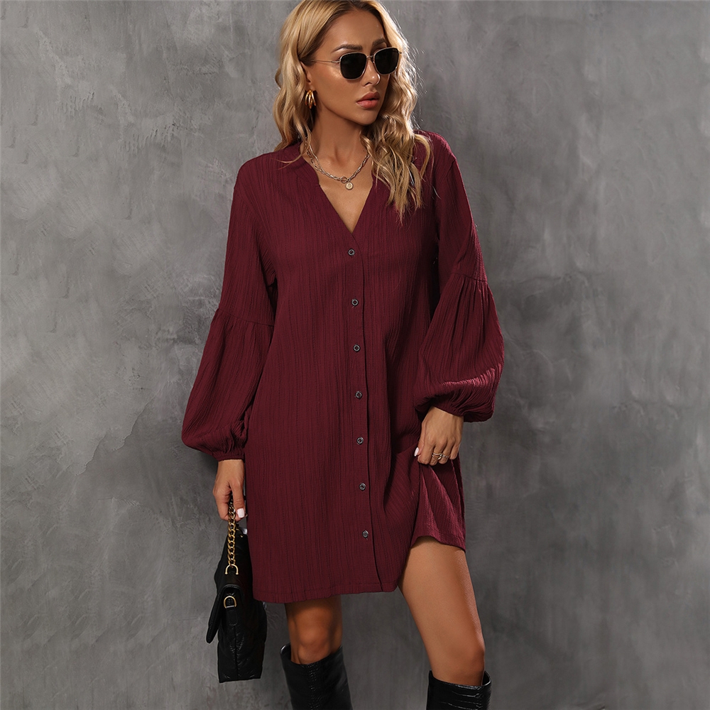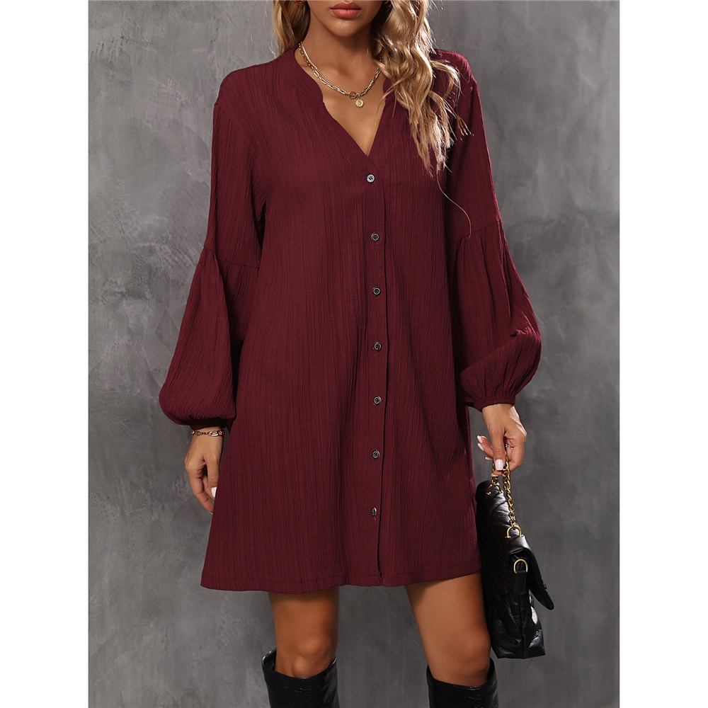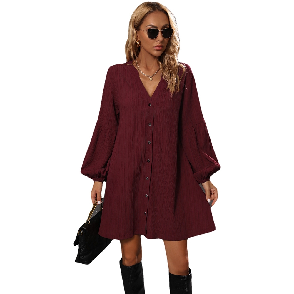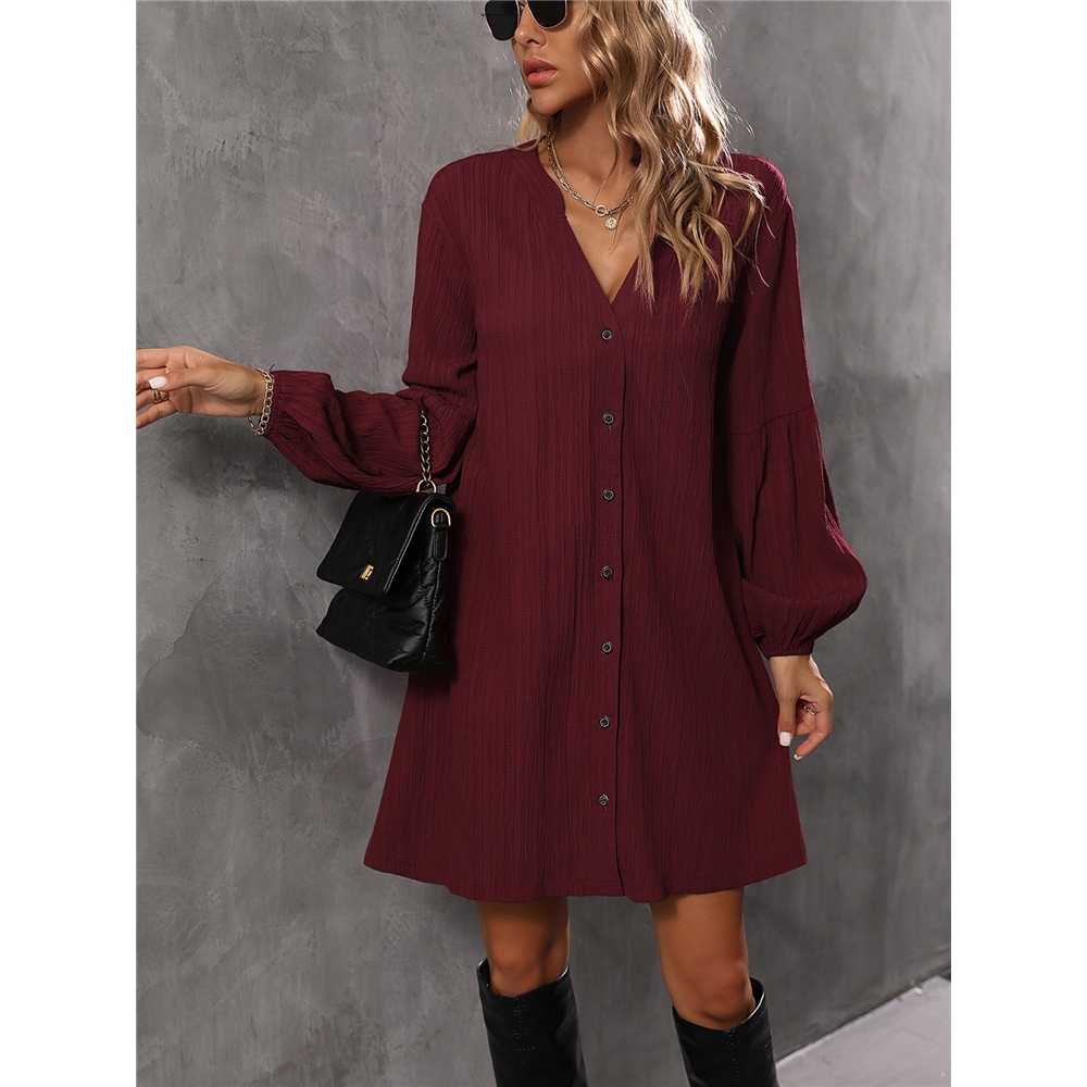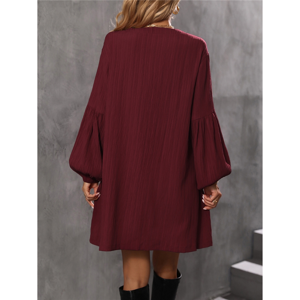 Solid Color Long Sleeves V-Neck Casual Loose Mini Dress
