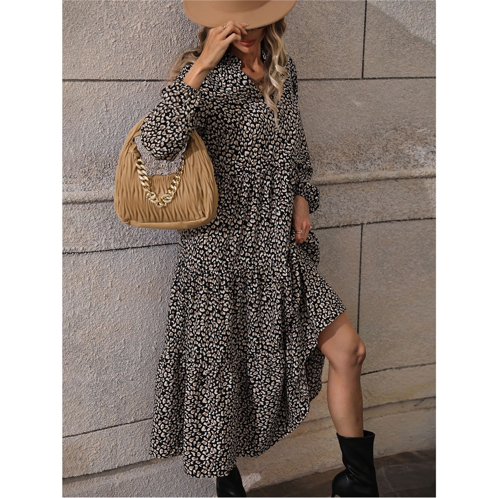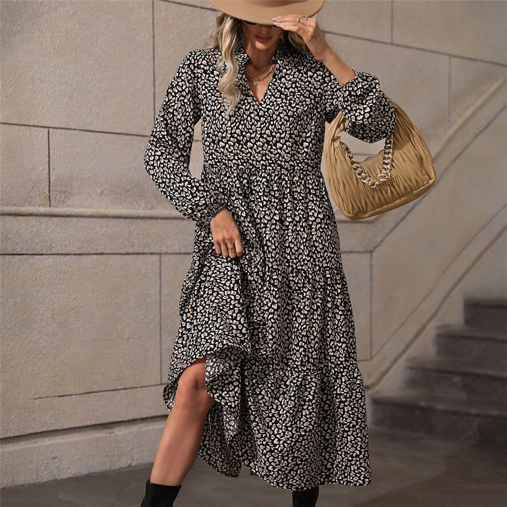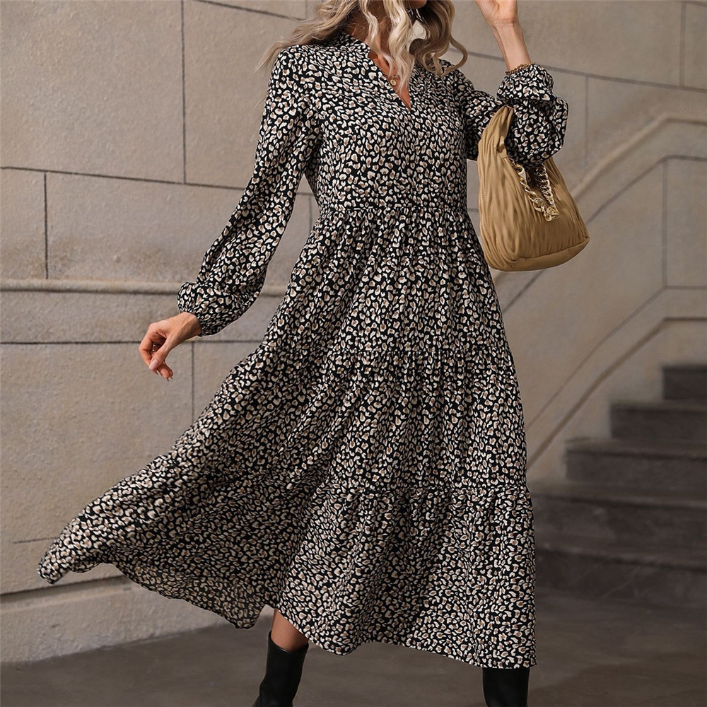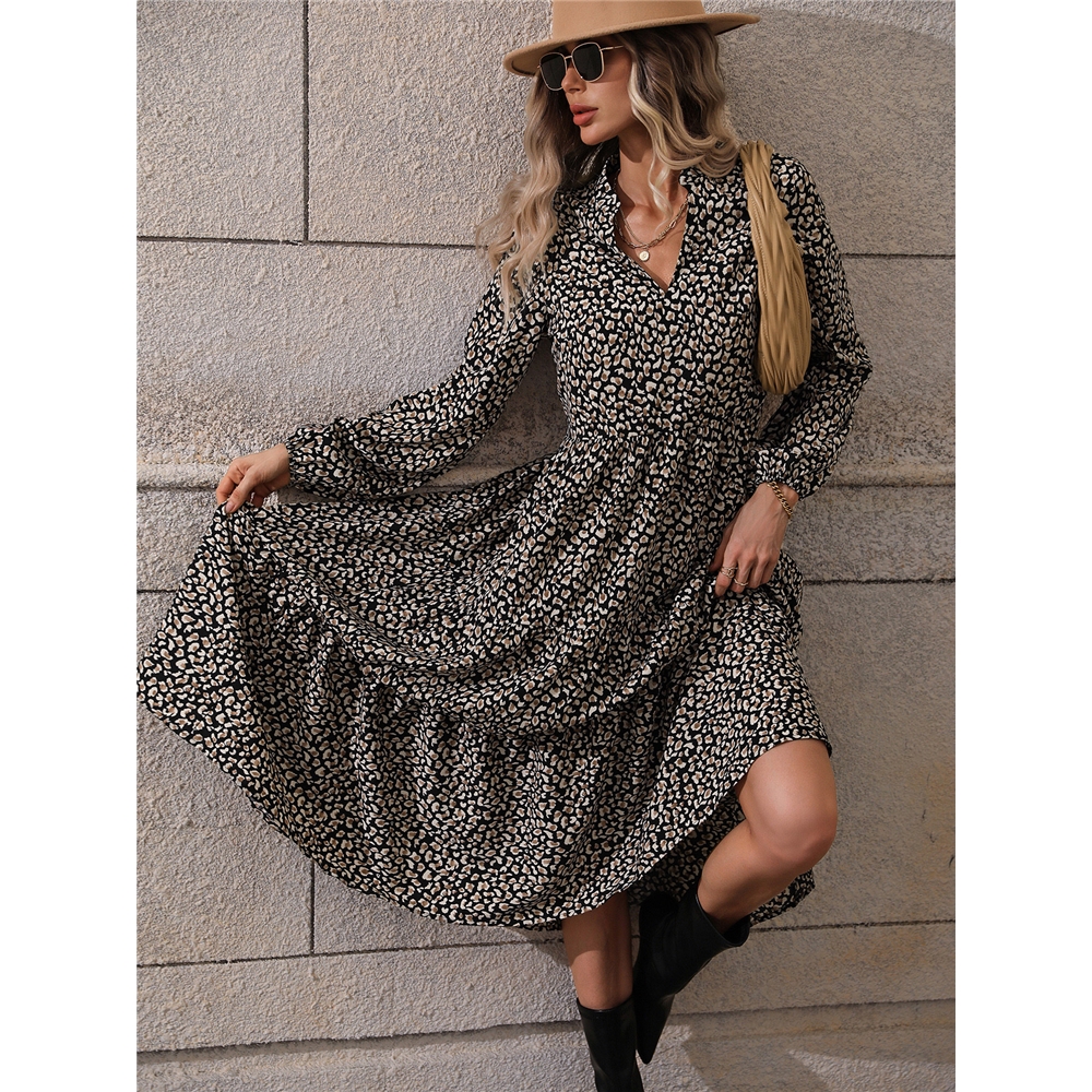 Long Sleeves V-Neck Printed Ruffled Max Dress
