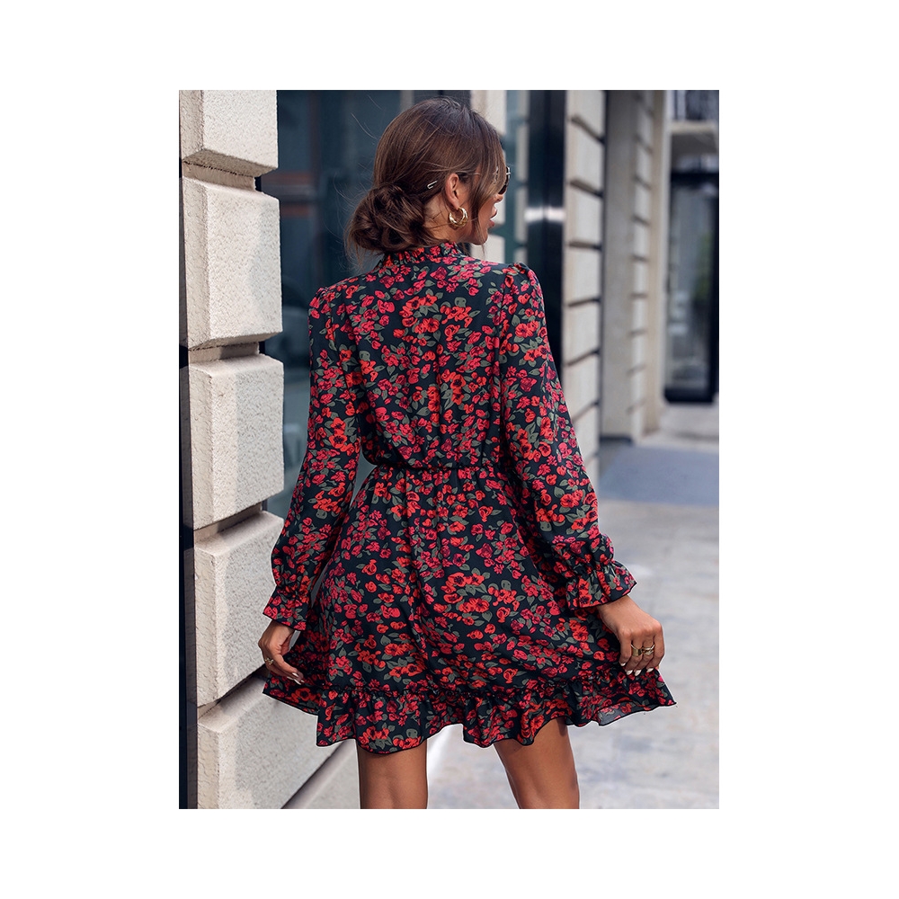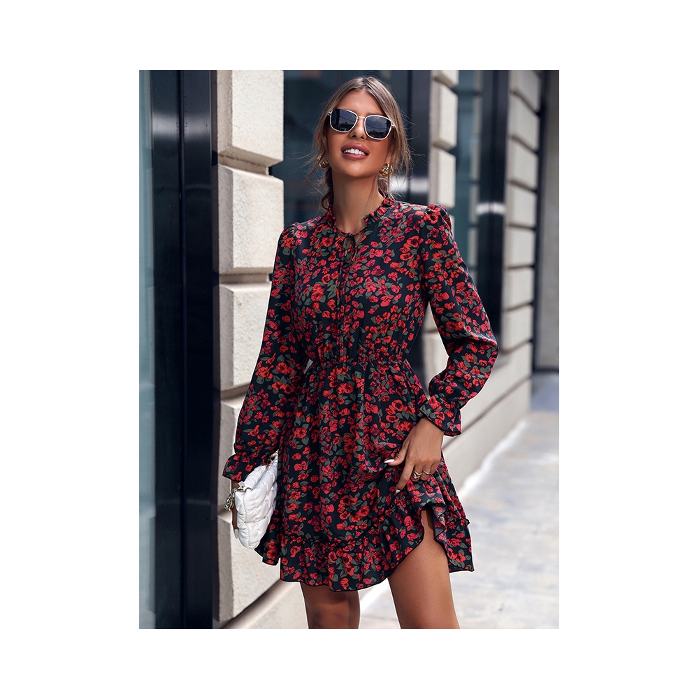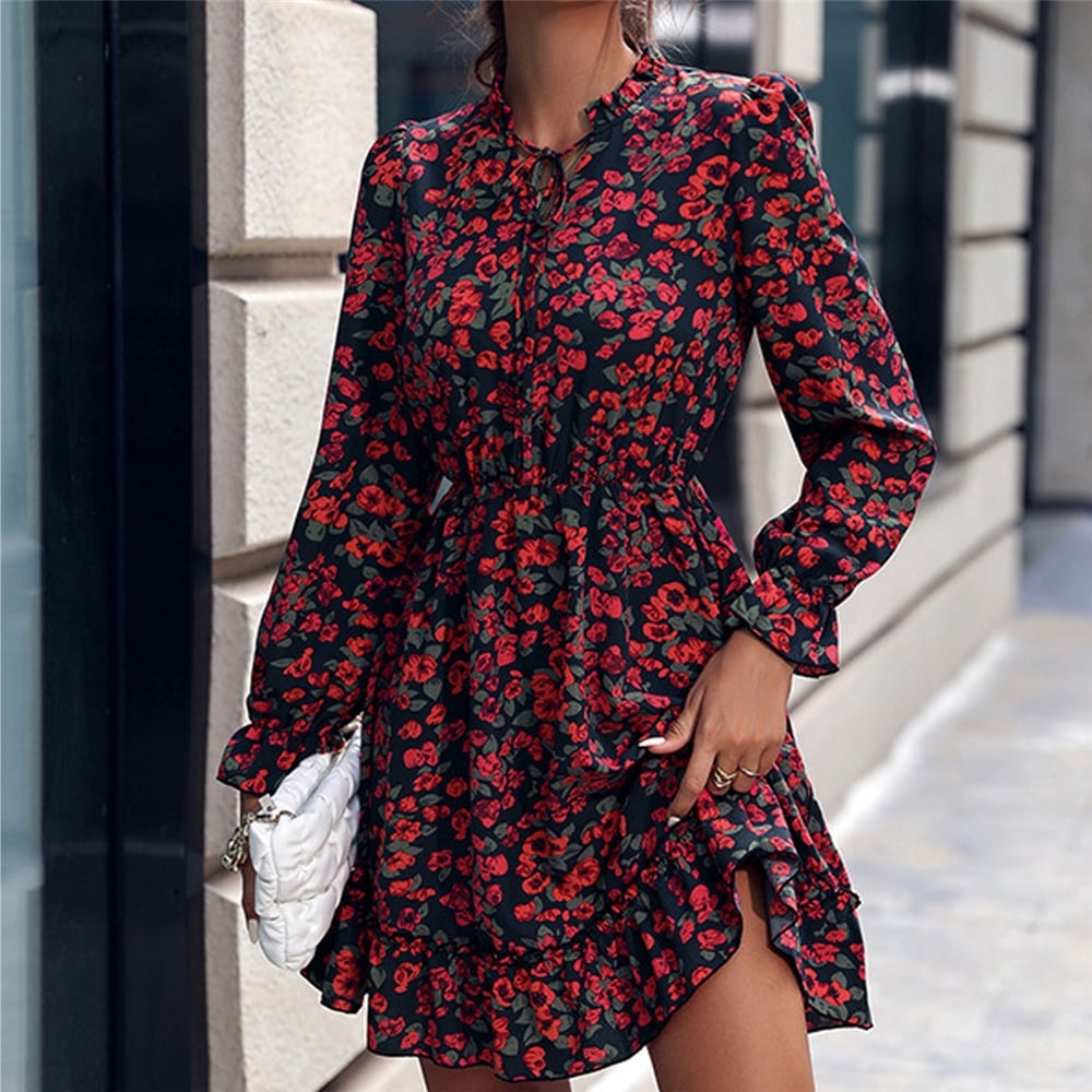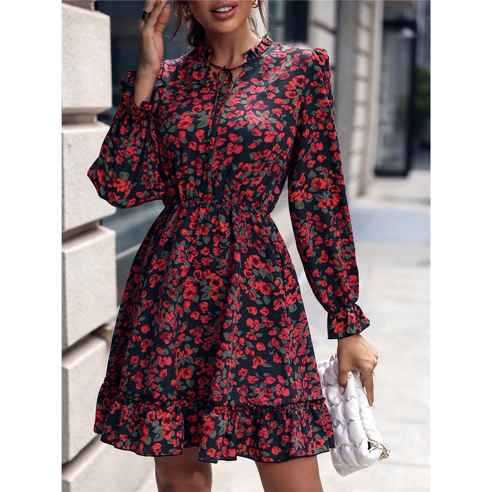 Long Sleeves Floral Printed Ruffled Elastic Waist Mini Dress