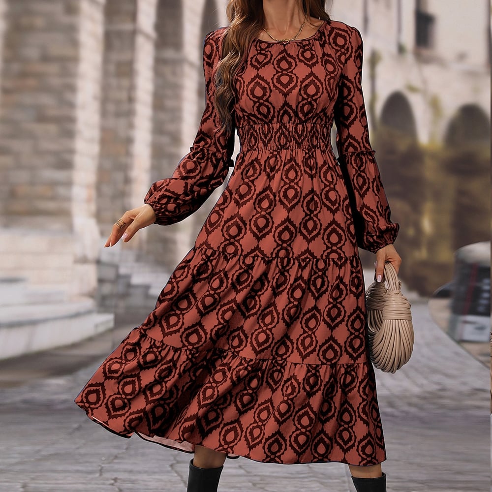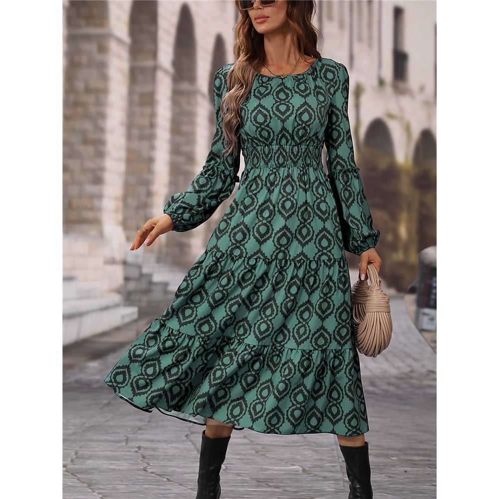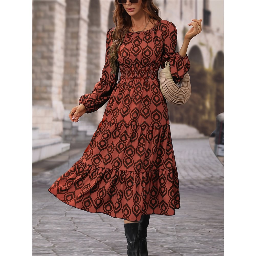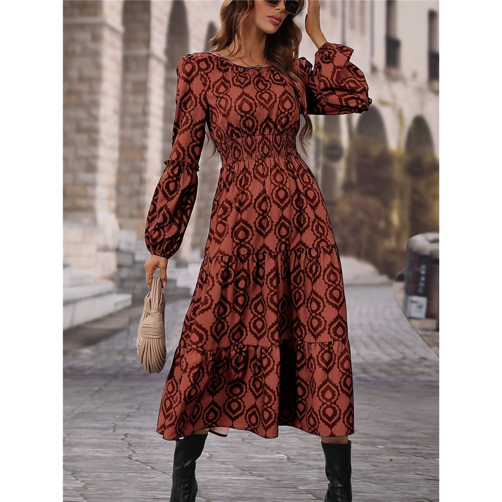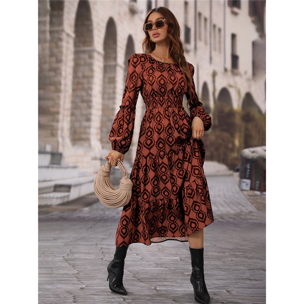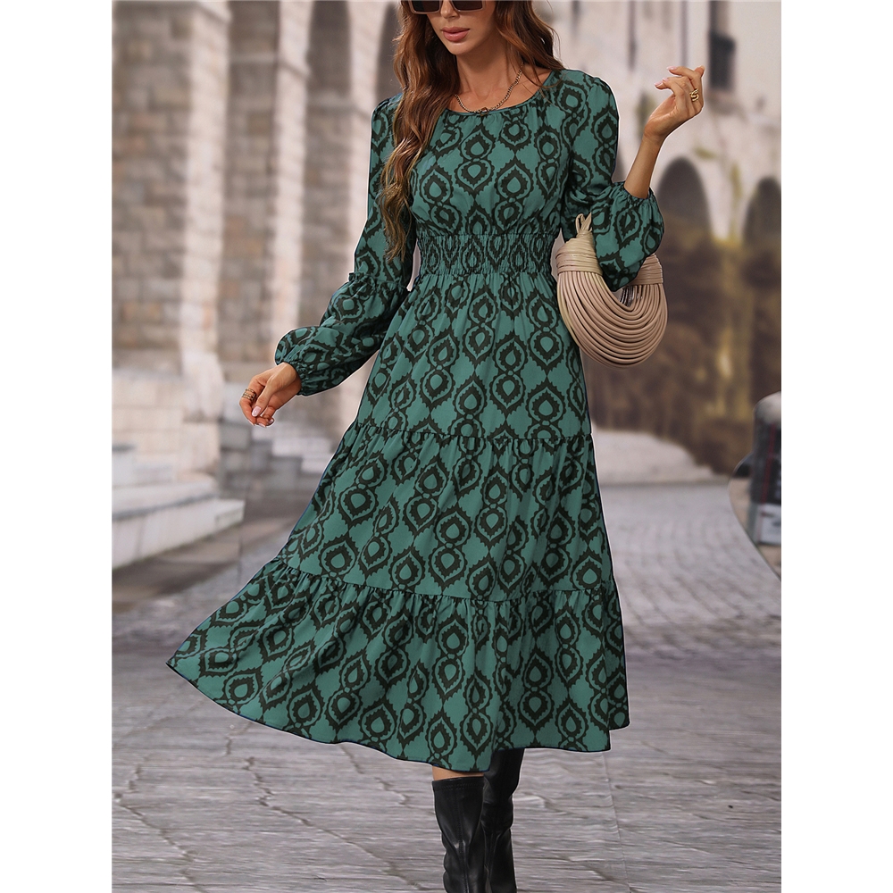 Loose Long Sleeves Round Neck Printed Maxi Dress