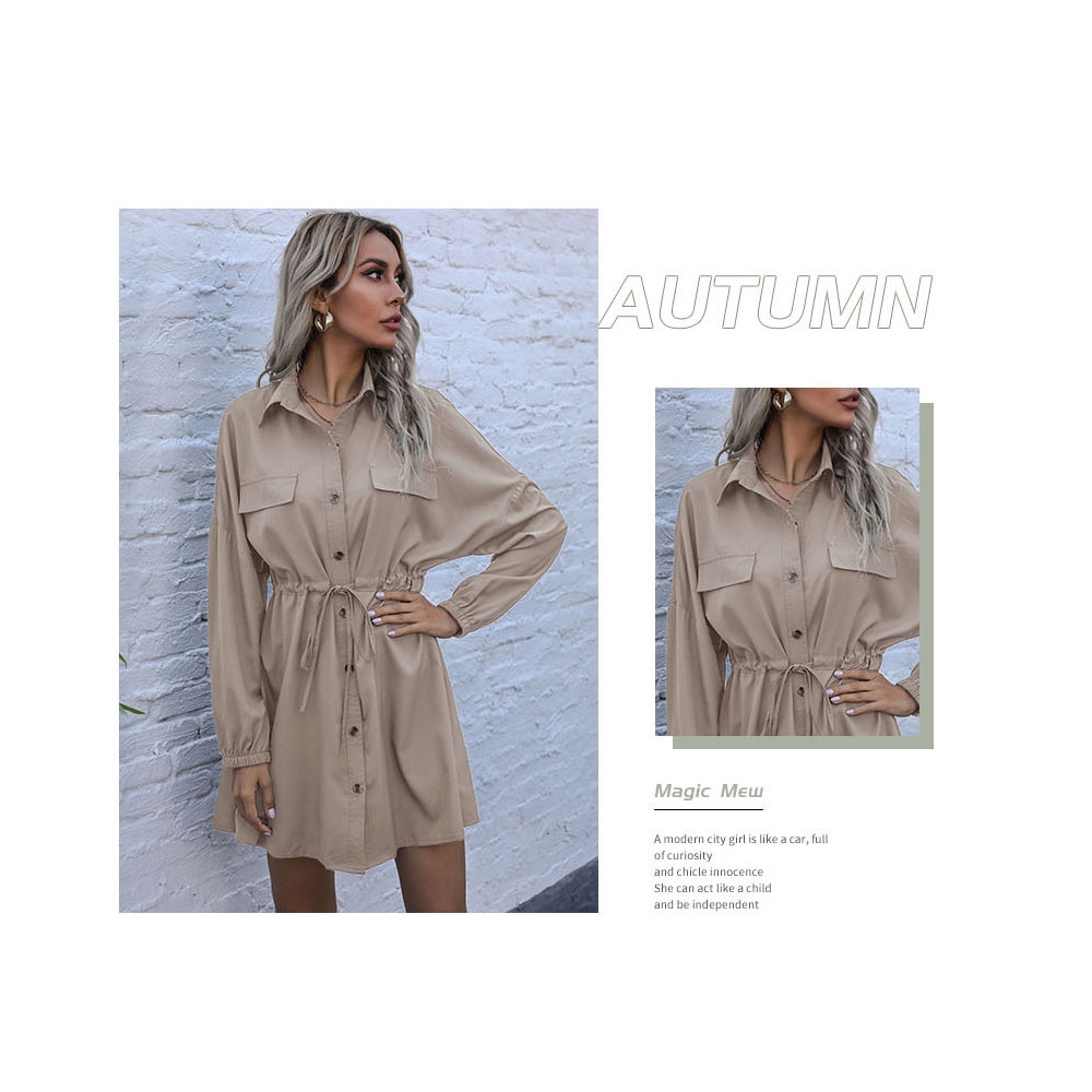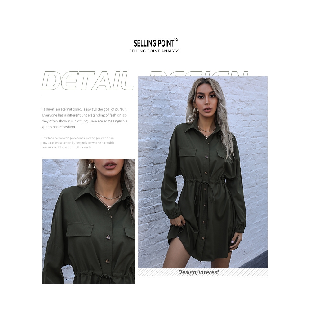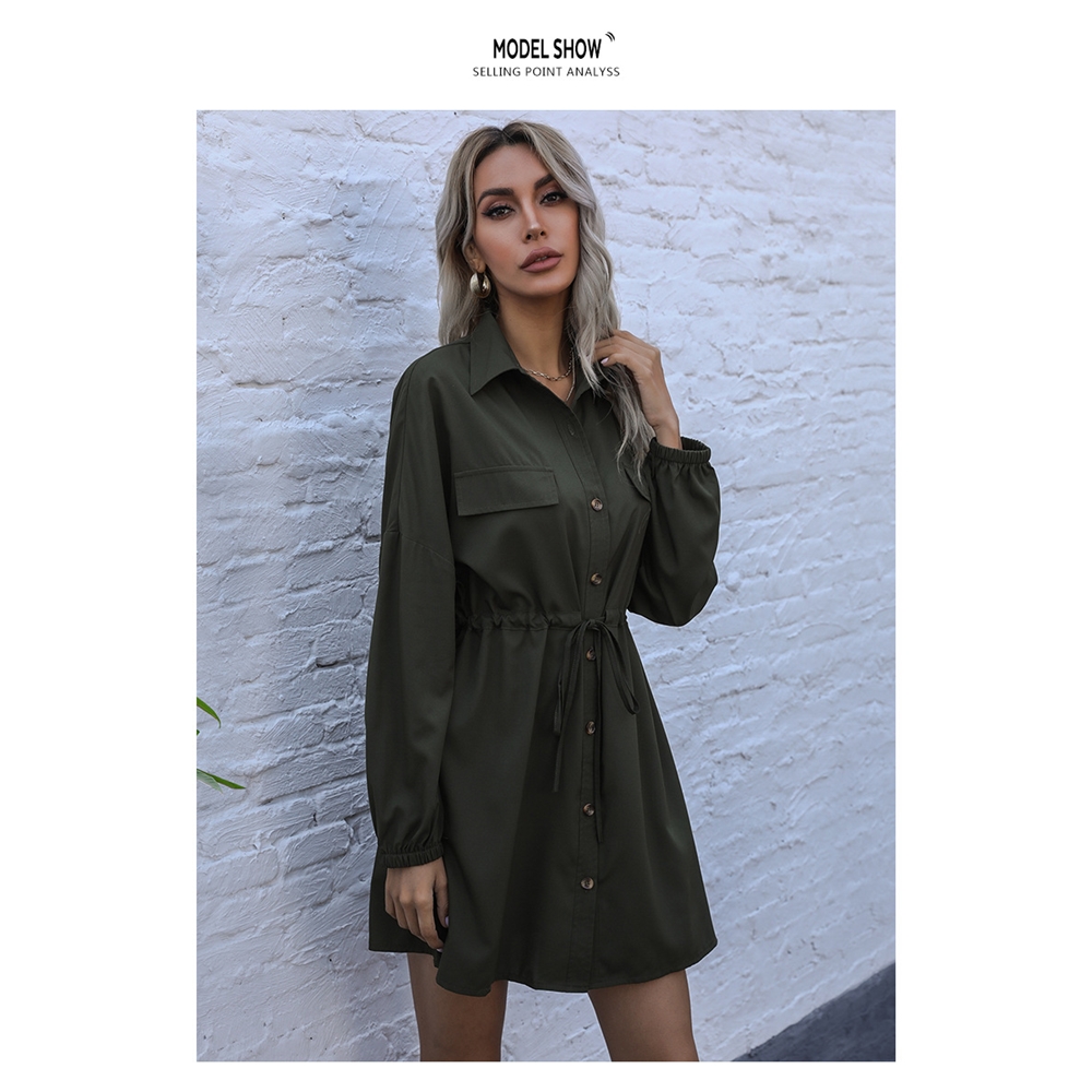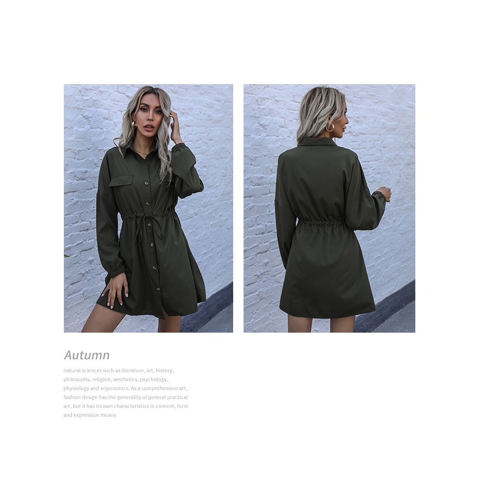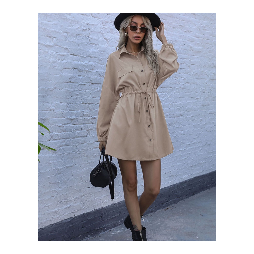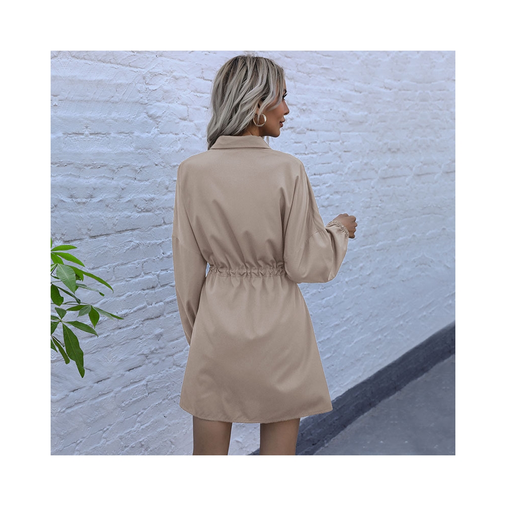 Solid Color Long Sleeves Lapel Drawstring Mini Shirt Dress