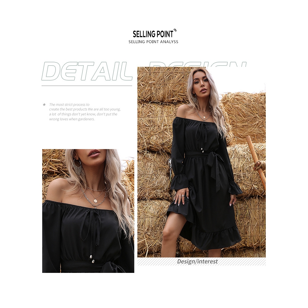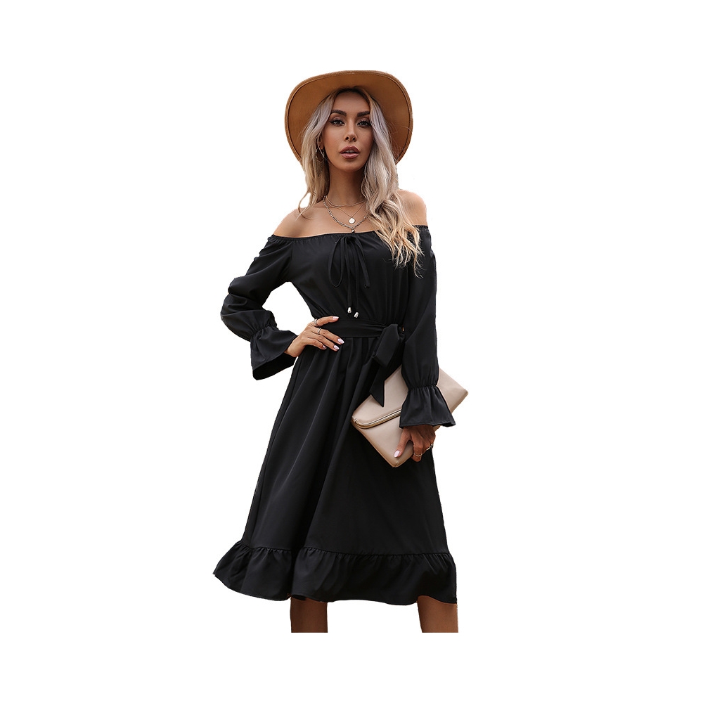 Solid Color Long Sleeves Boat Neck Tied Ruffled Midi Dress