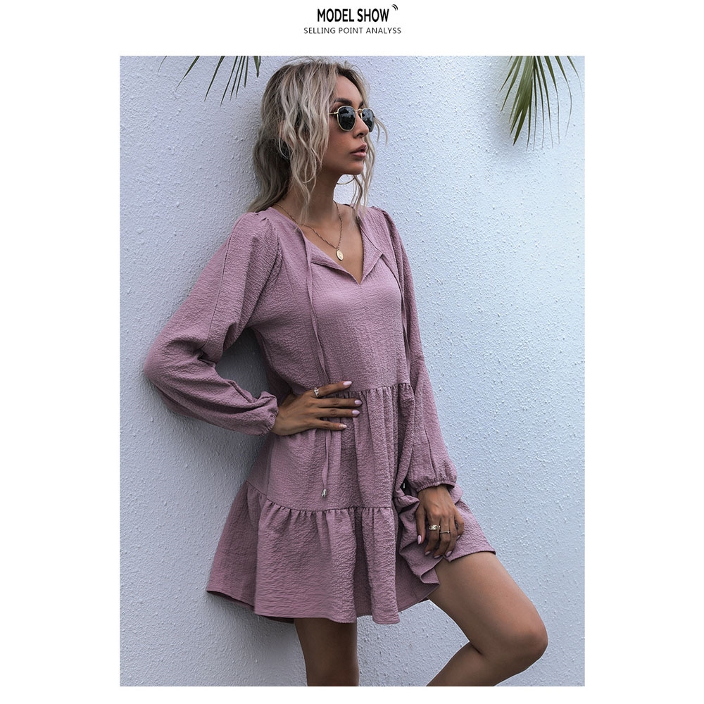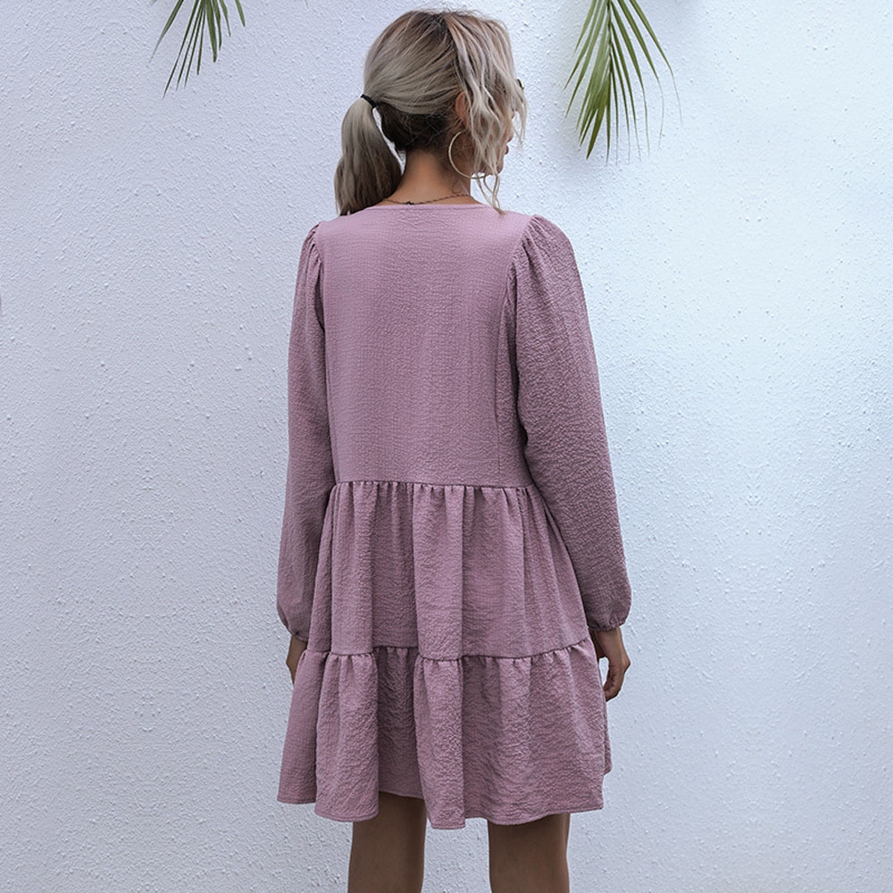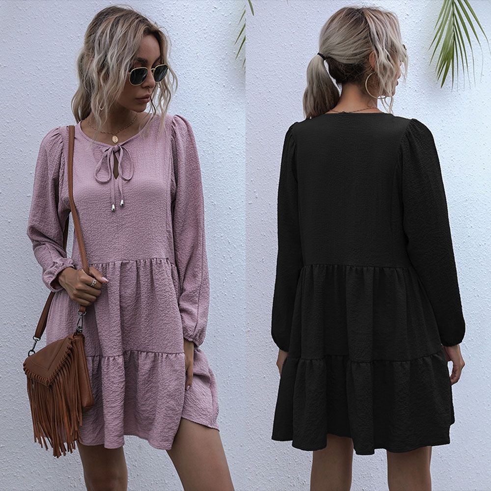 Solid Color Long Sleeves Crewneck Tied Ruffled Casual Mini Dress