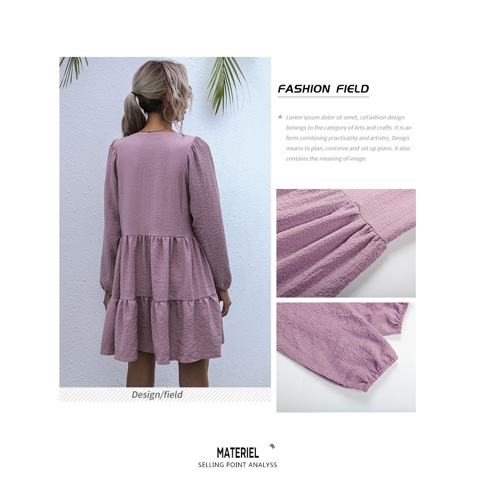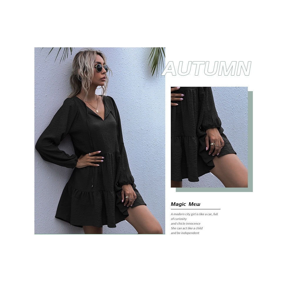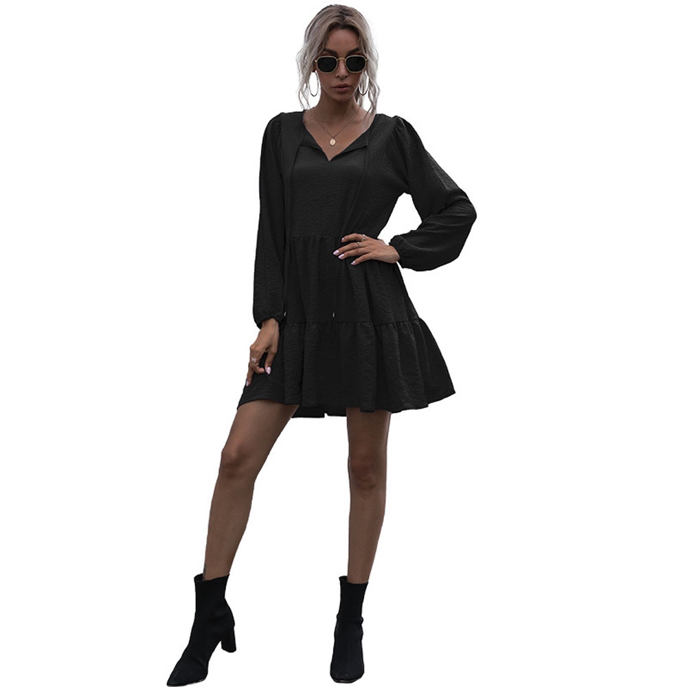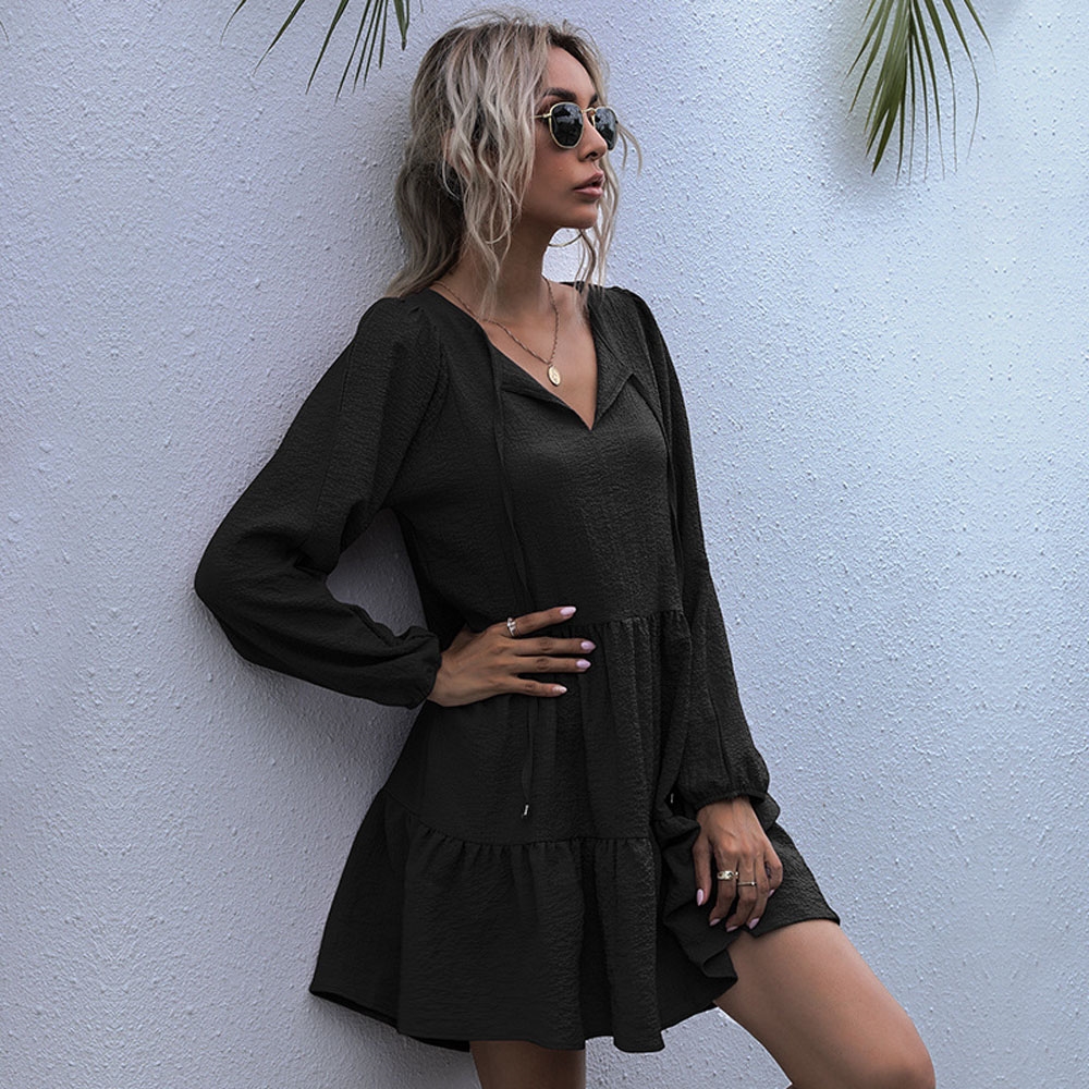 Solid Color Long Sleeves Crewneck Tied Ruffled Casual Mini Dress