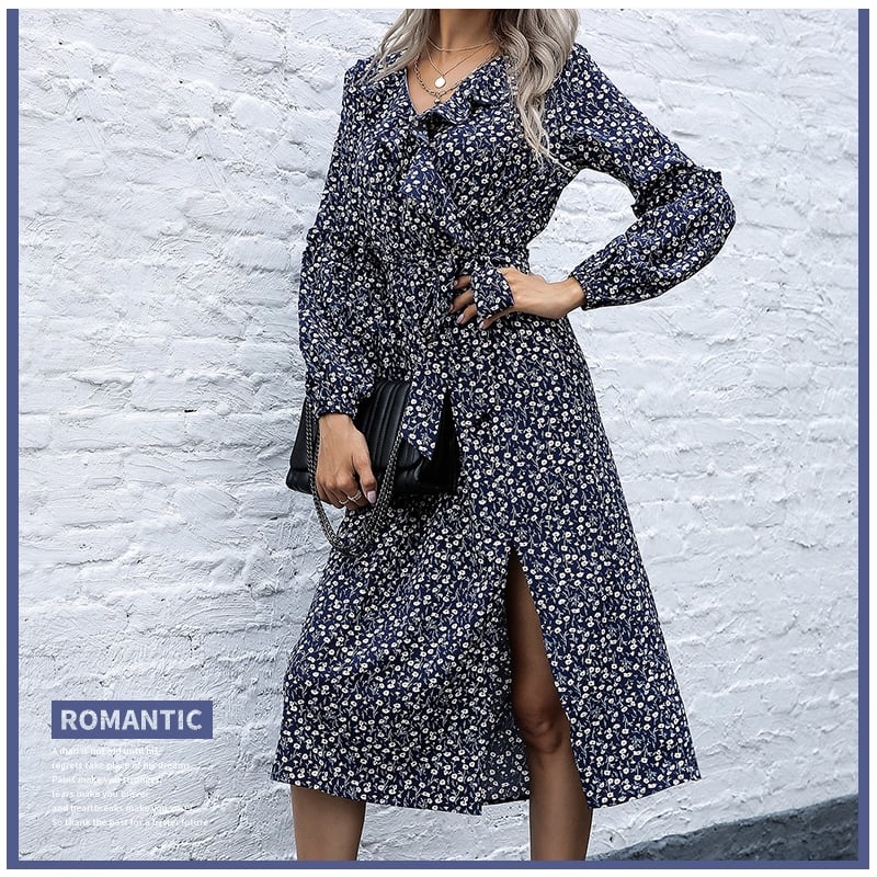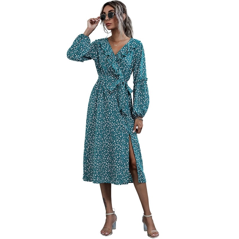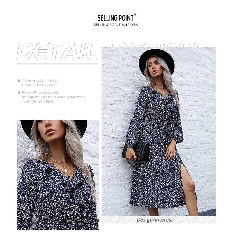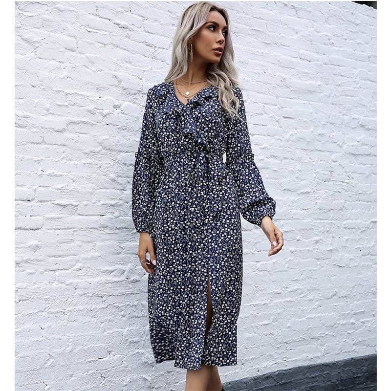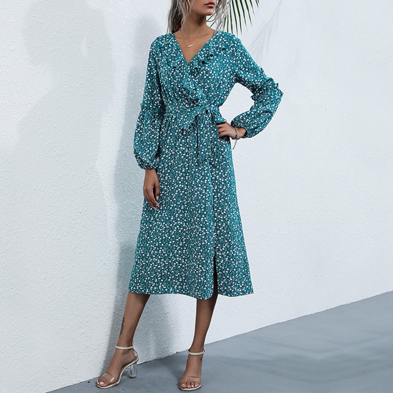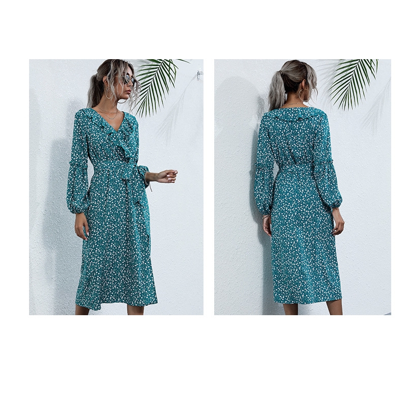 Long Sleeves Floral Printed Falbala V-Neck Elastic Waist A-Line Midi Dress