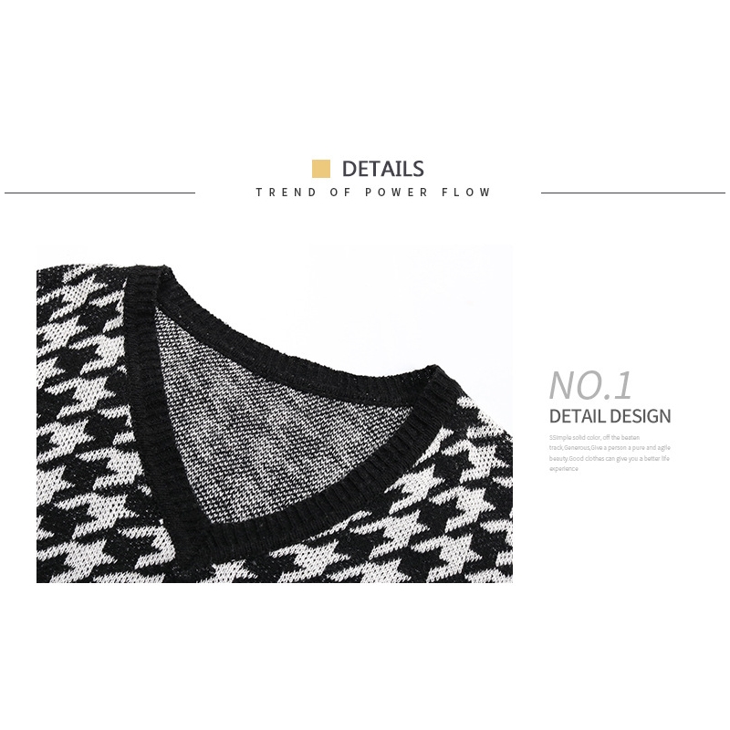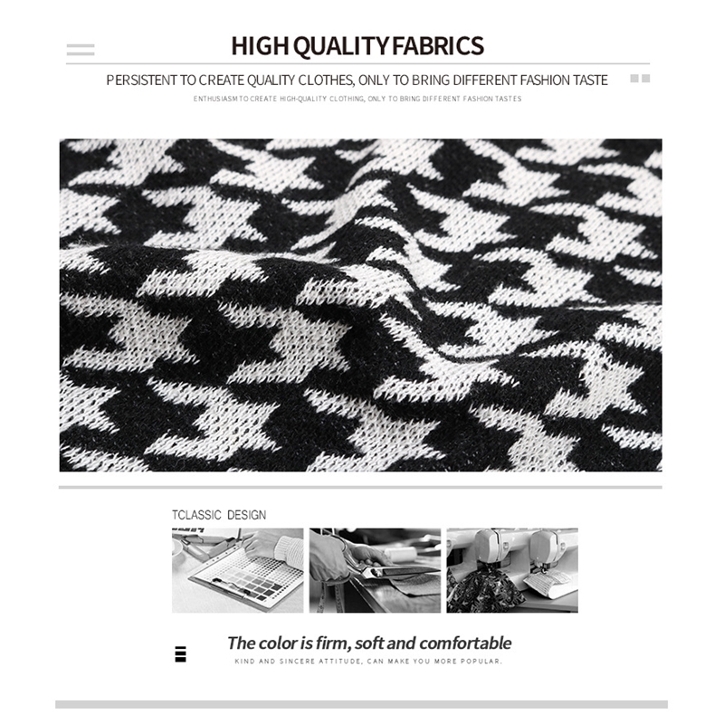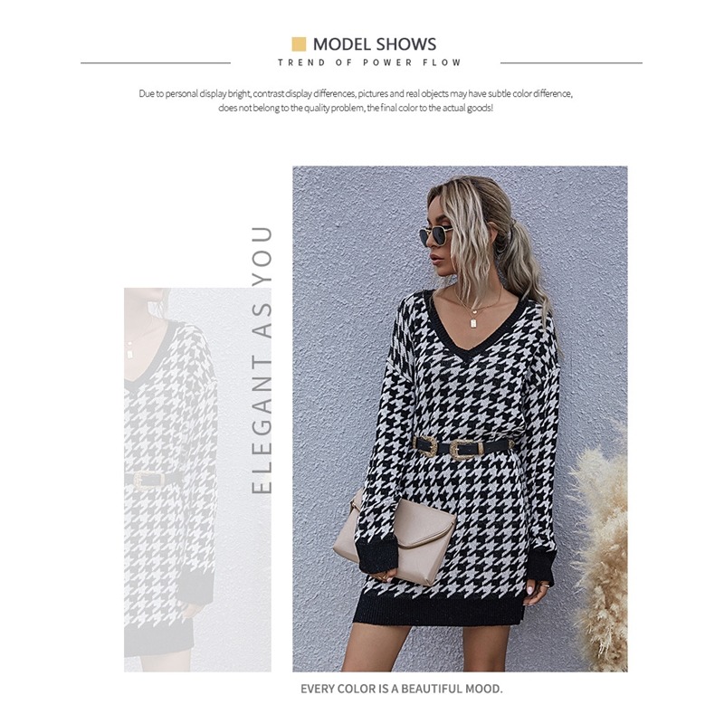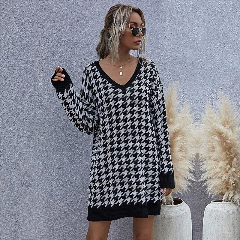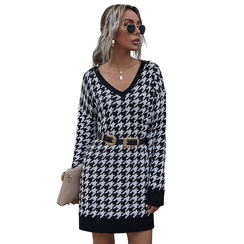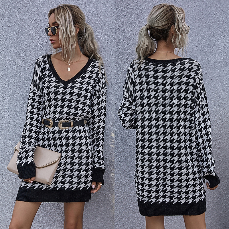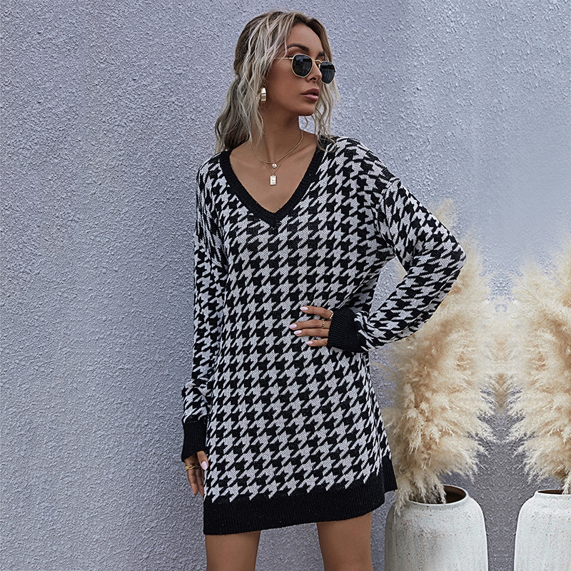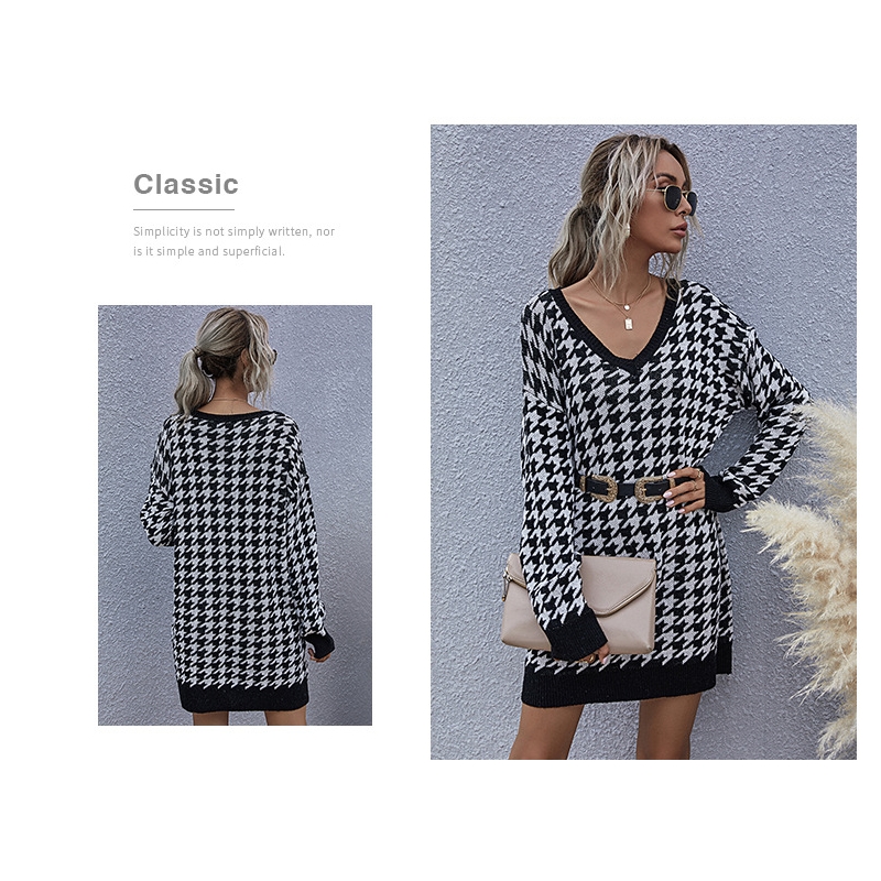 Retro Houndstooth Long Sleeves V-Neck Knitted Mini Dress