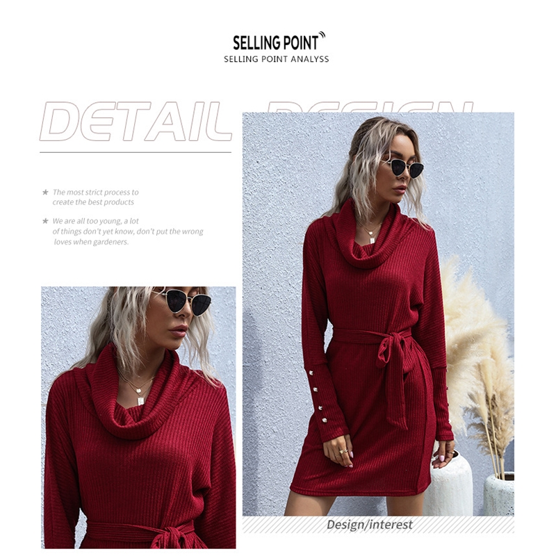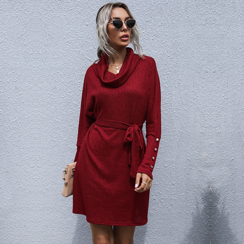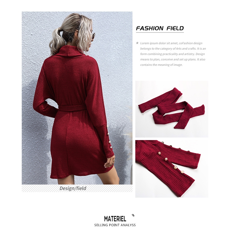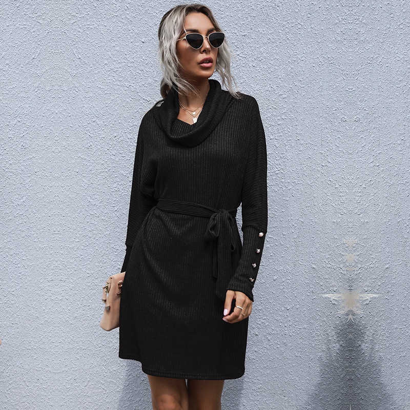 Solid Color Long Sleeves Heaps Collar Knitted Mini Dress