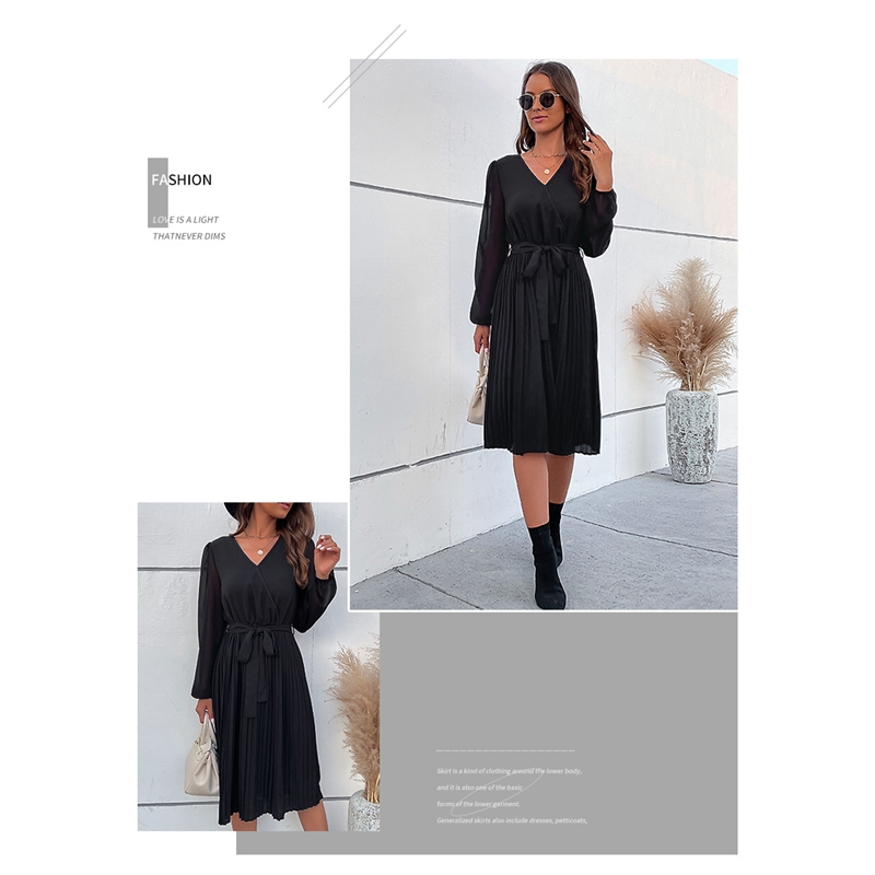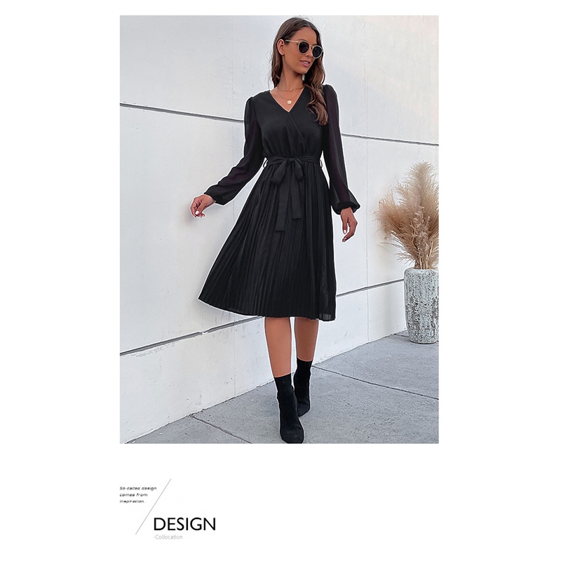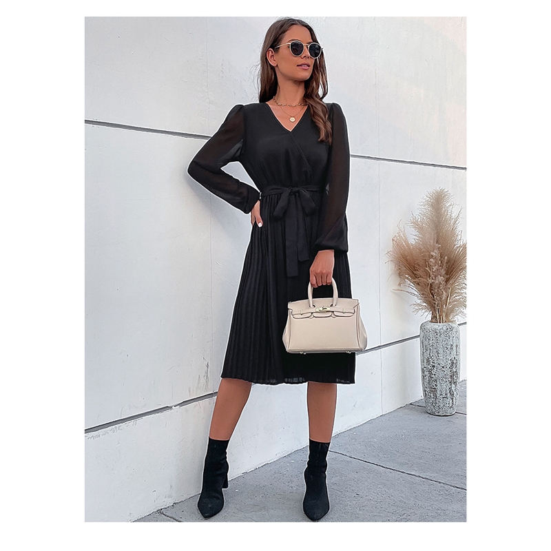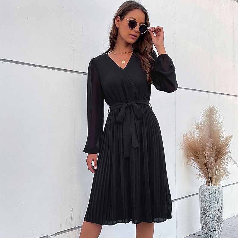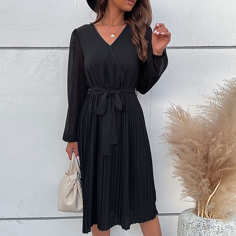 Solid Color Long Sleeves V-Neck Tied Pleated Dress