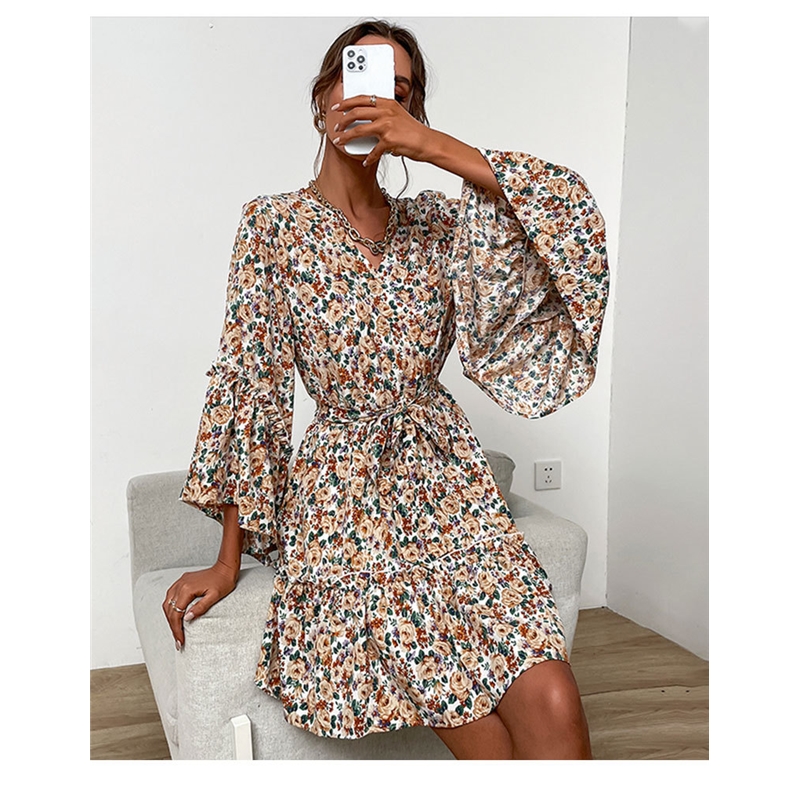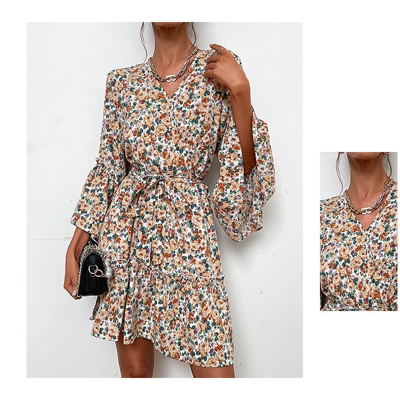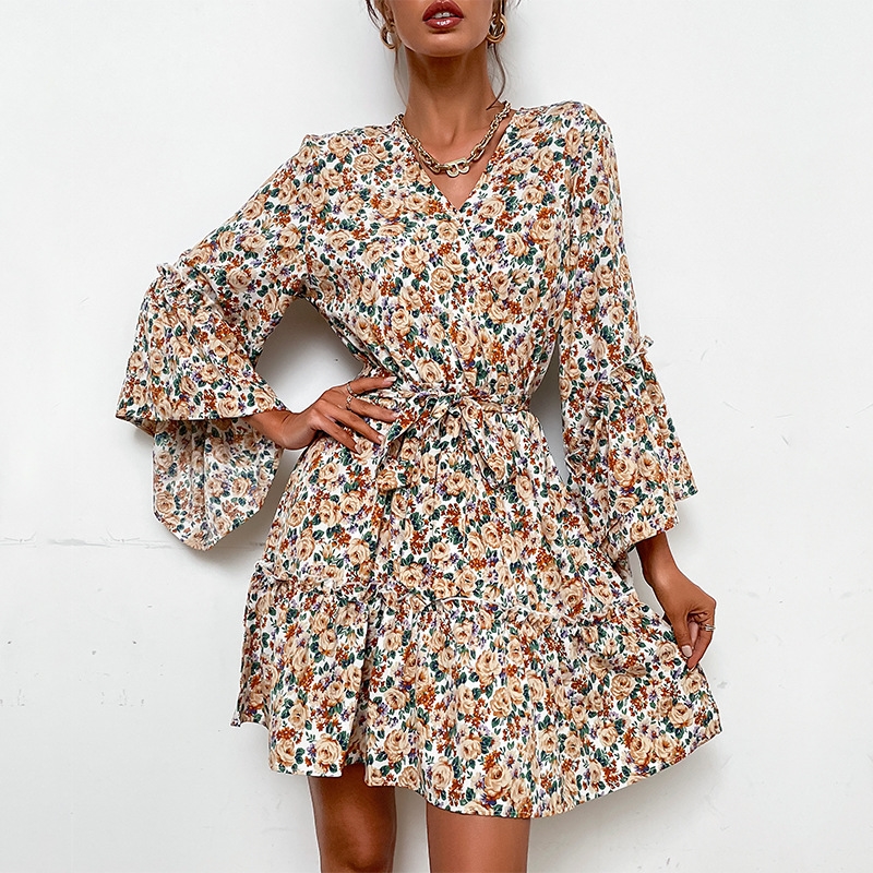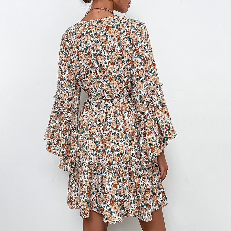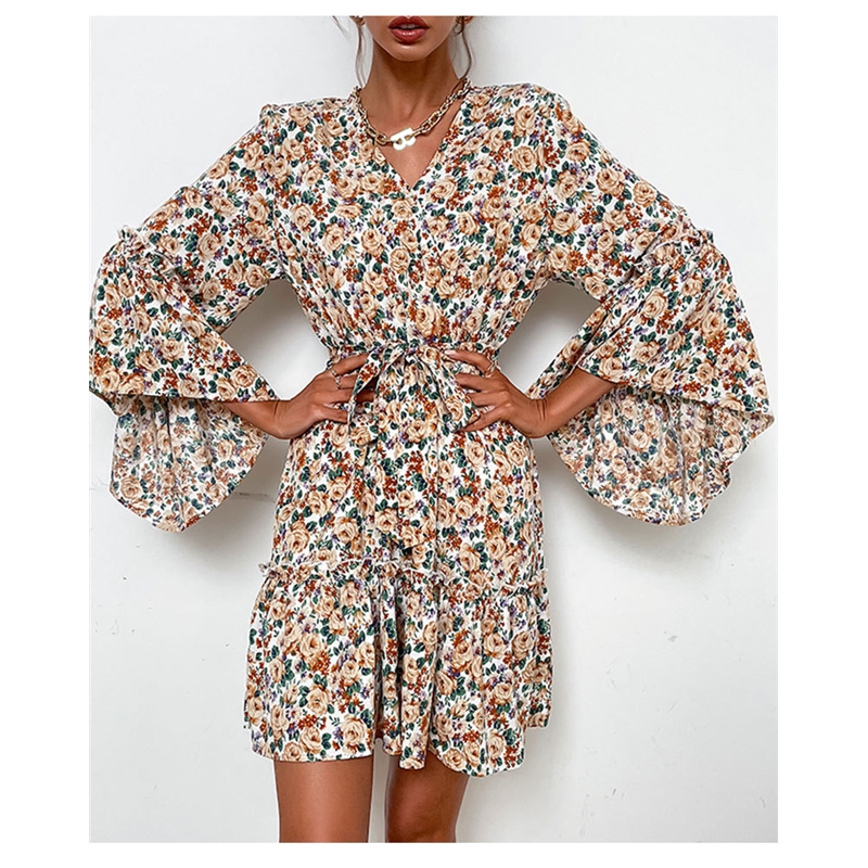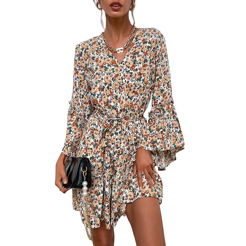 V-Neck Long Falbala Sleeves Floral Printed Tied Dress
