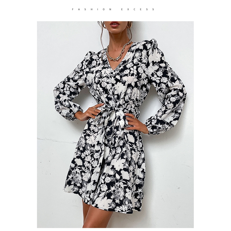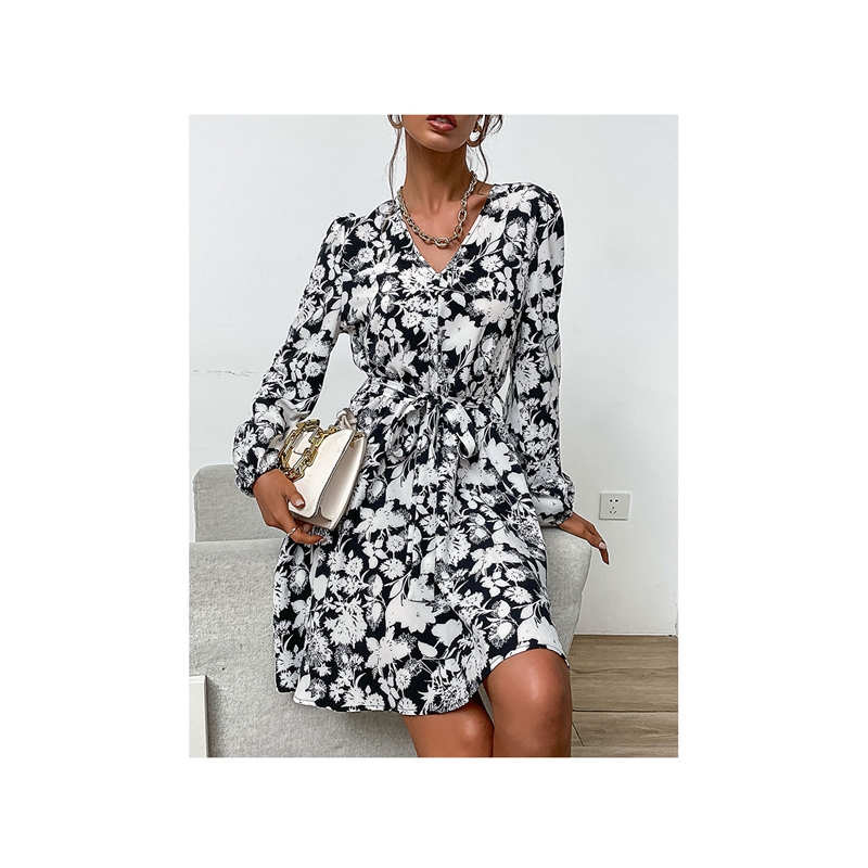 V-Neck Long Sleeved Floral Printed Tied Dress