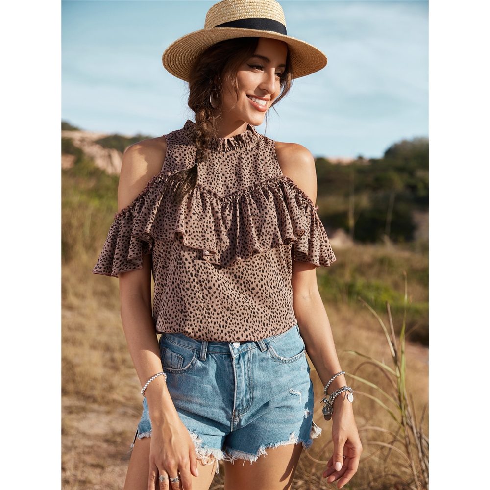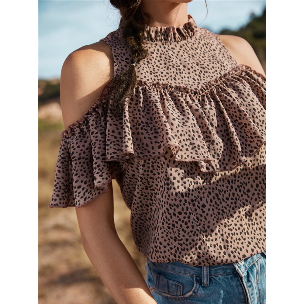 Bare Shoulders Falbala Leopard Printed Short Sleeves Blouse