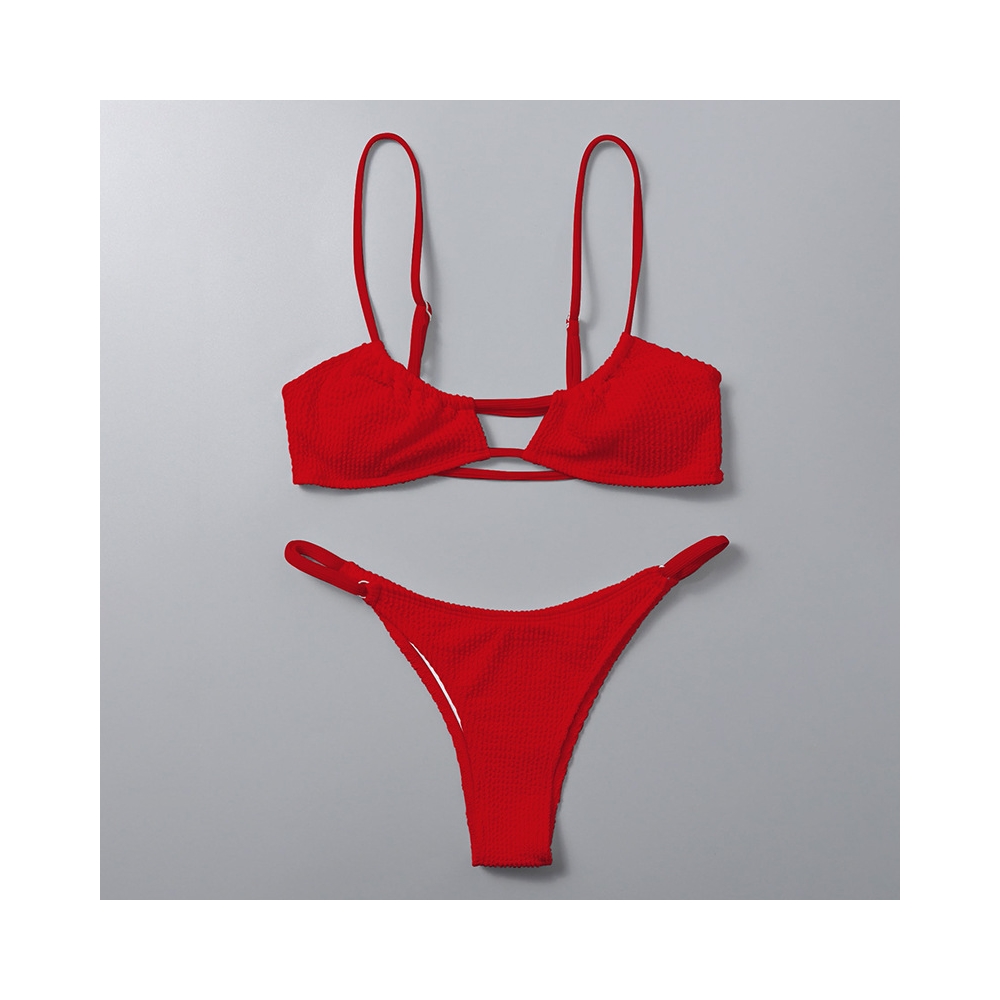 Solid Color Spaghetti-Neck Padded Bra And Thong Two Pieces Bikini Swimsuits