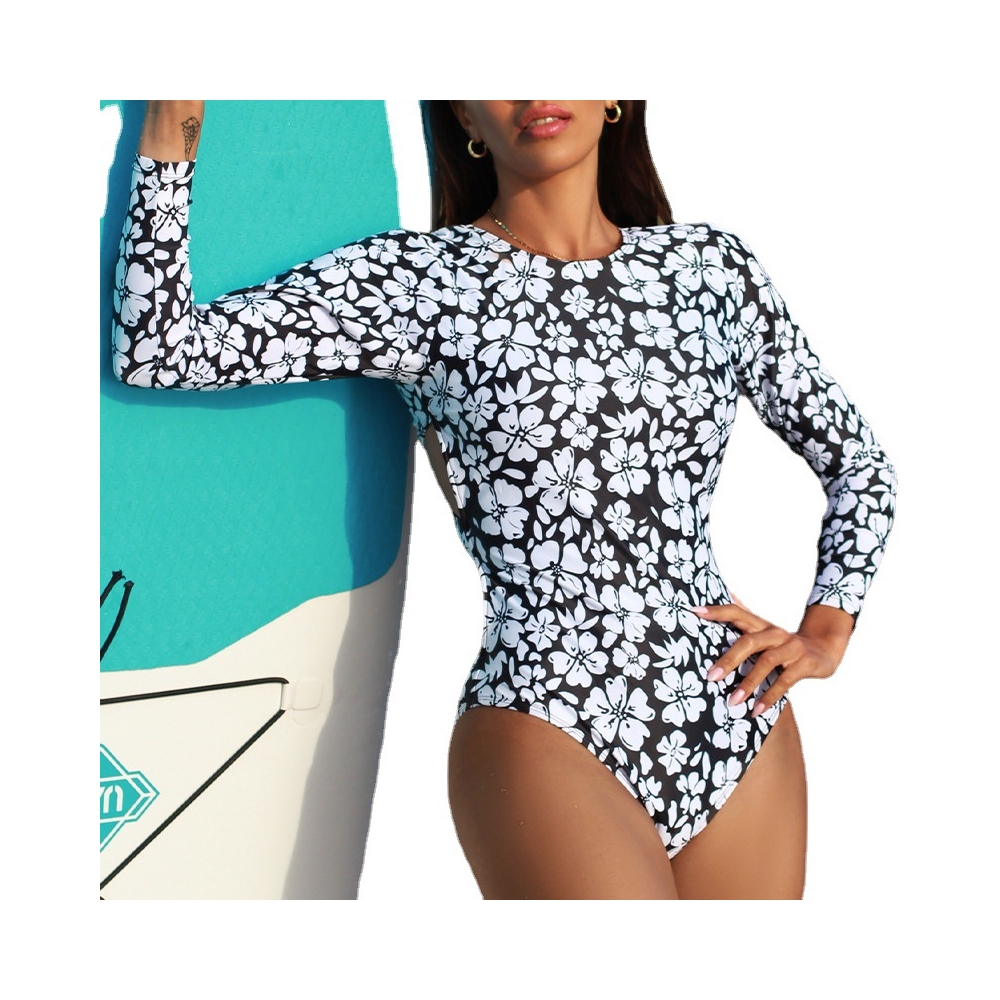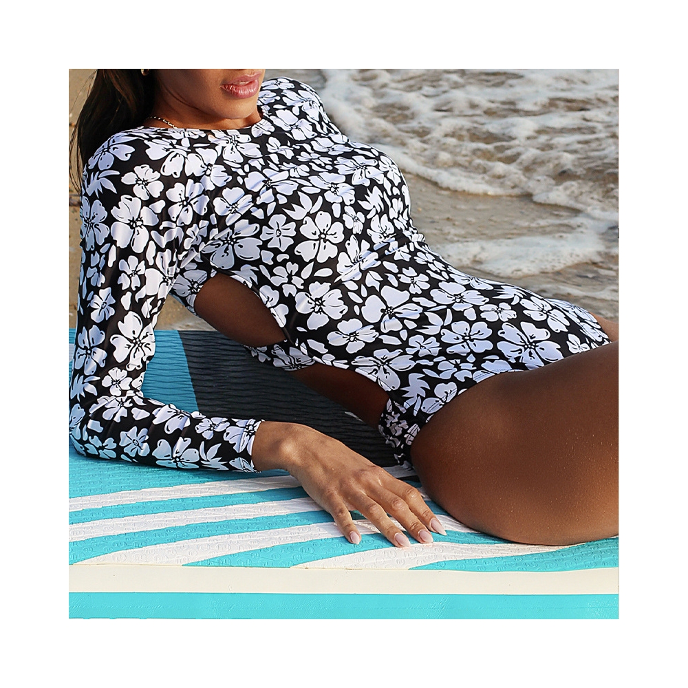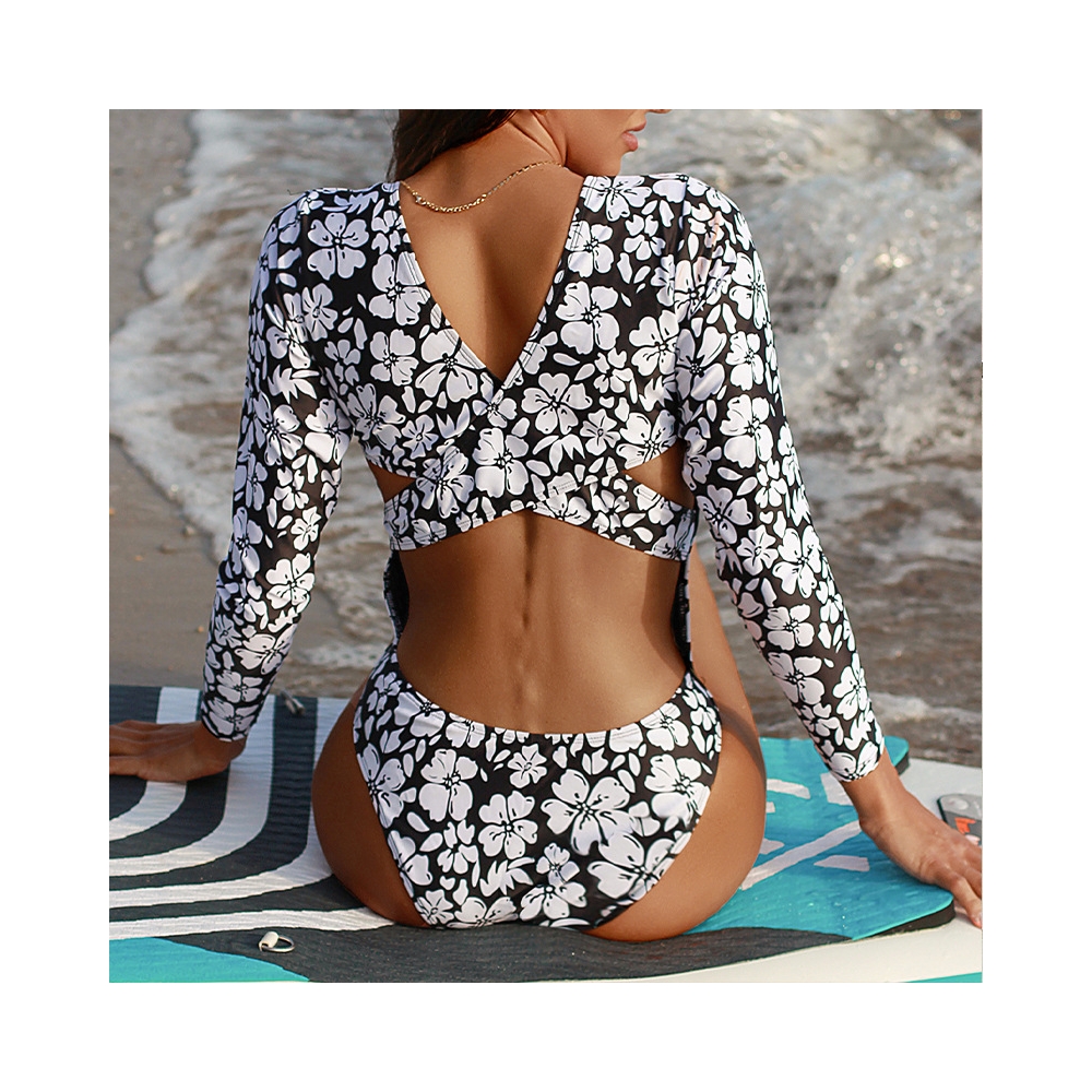 Long Sleeves Flower Printed Hollow Briefs One Piece Swimwear