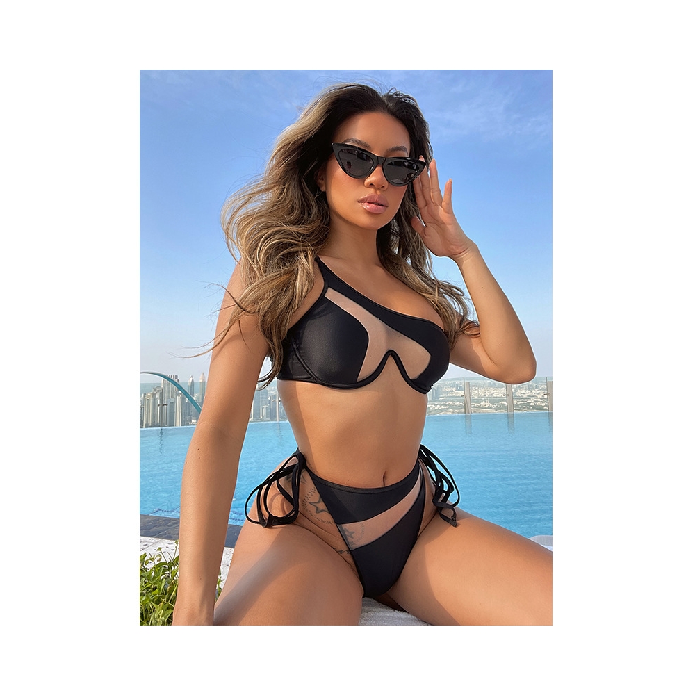 Solid Color Hollow One-Shoulder Padded Bra And Briefs Two Pieces Bikini