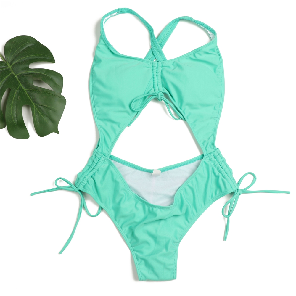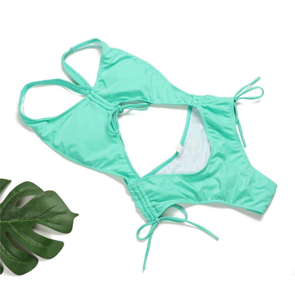 Solid Color Drawstring Backless Bikini One-Piece Swimsuit