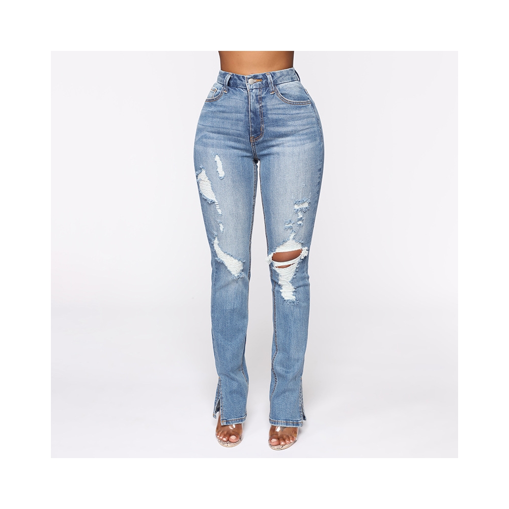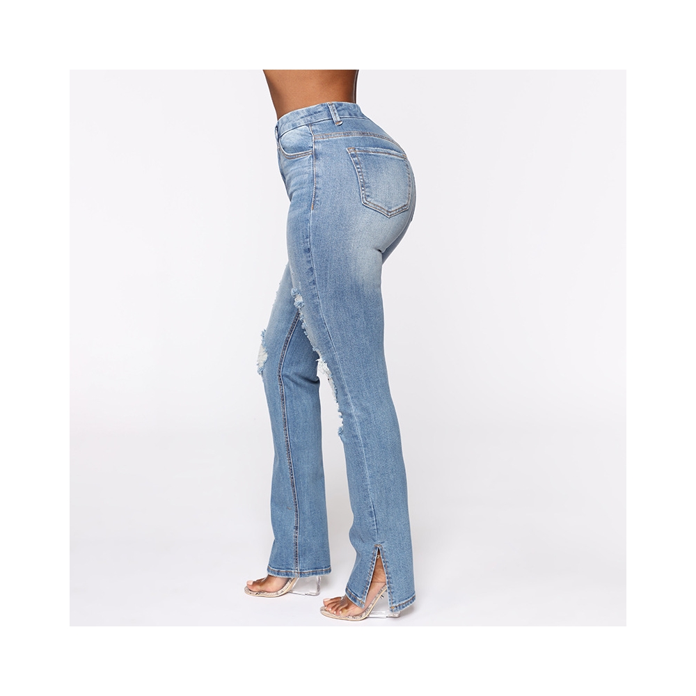 High Waisted Rippedd Hole Side Slit Hem Jeans