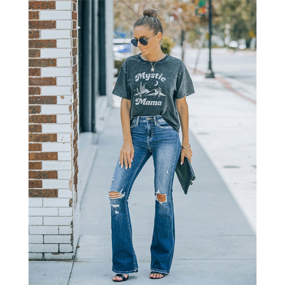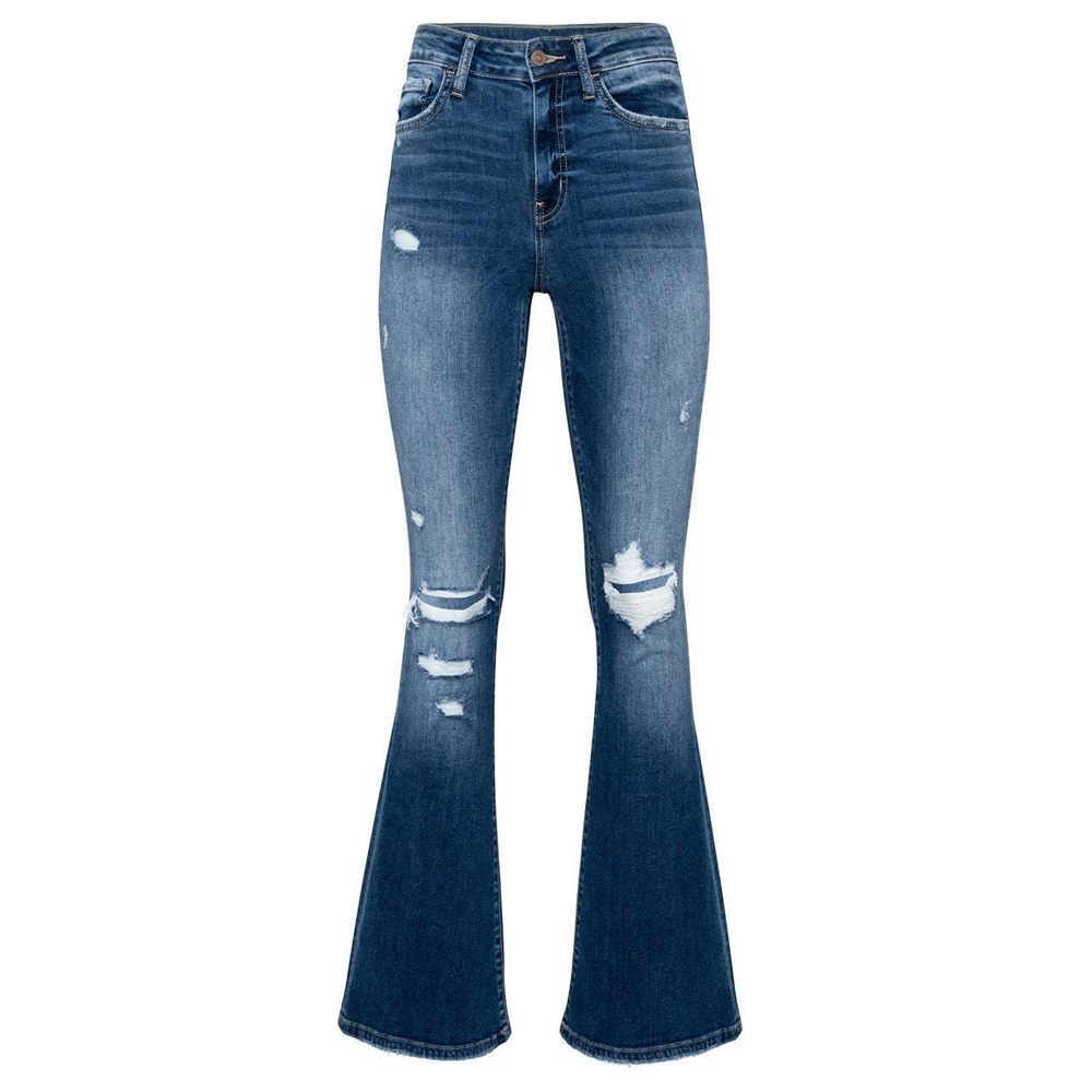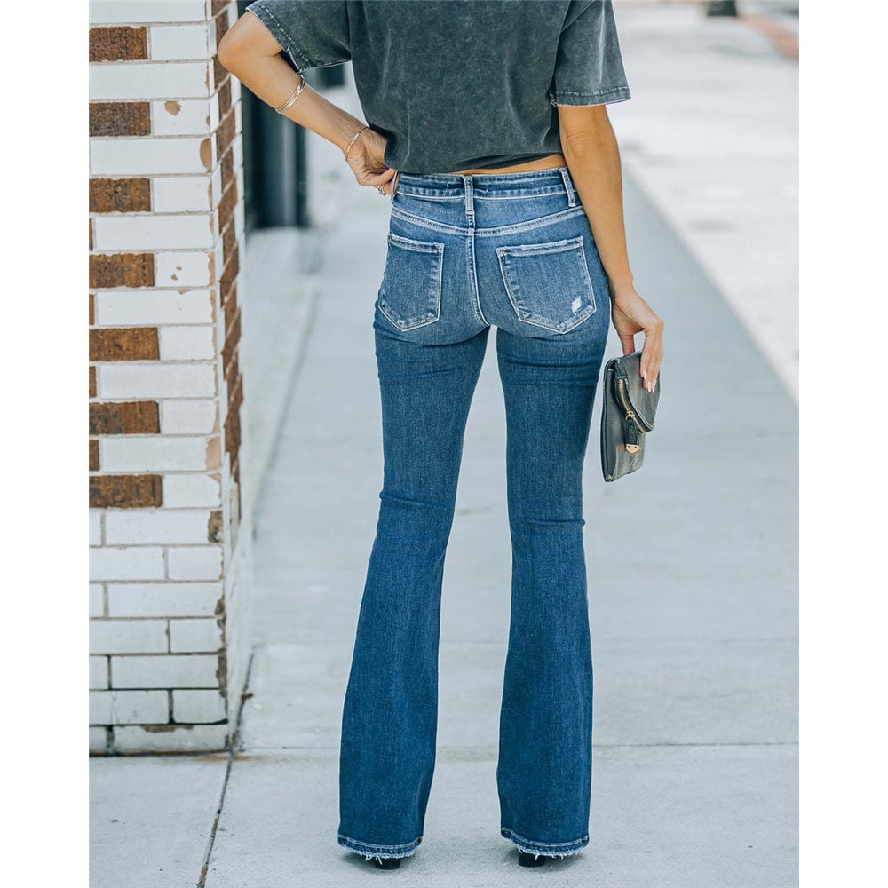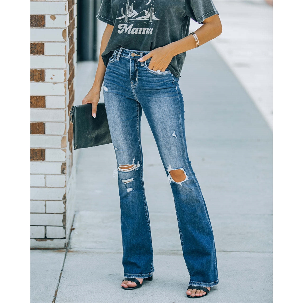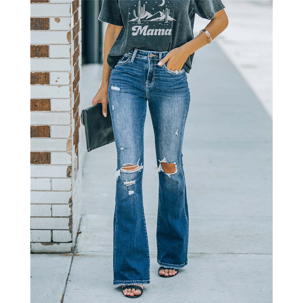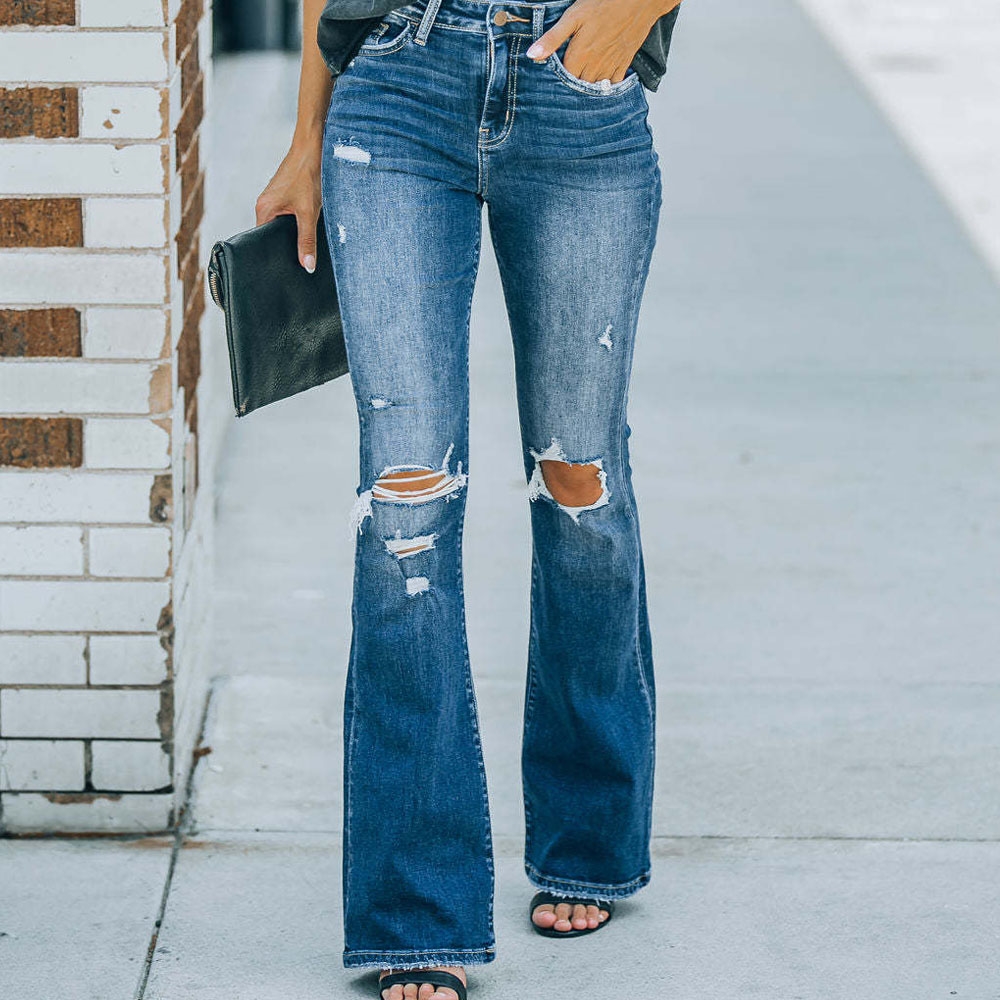 High Waisted Ripped Hole Distressed Flared Denim Pants Jeans