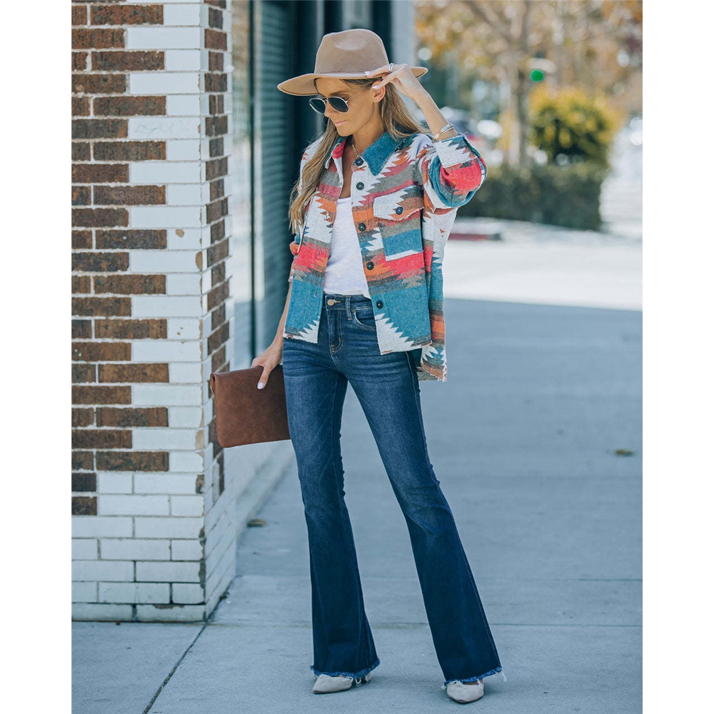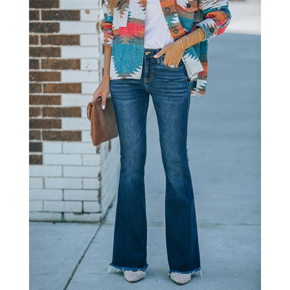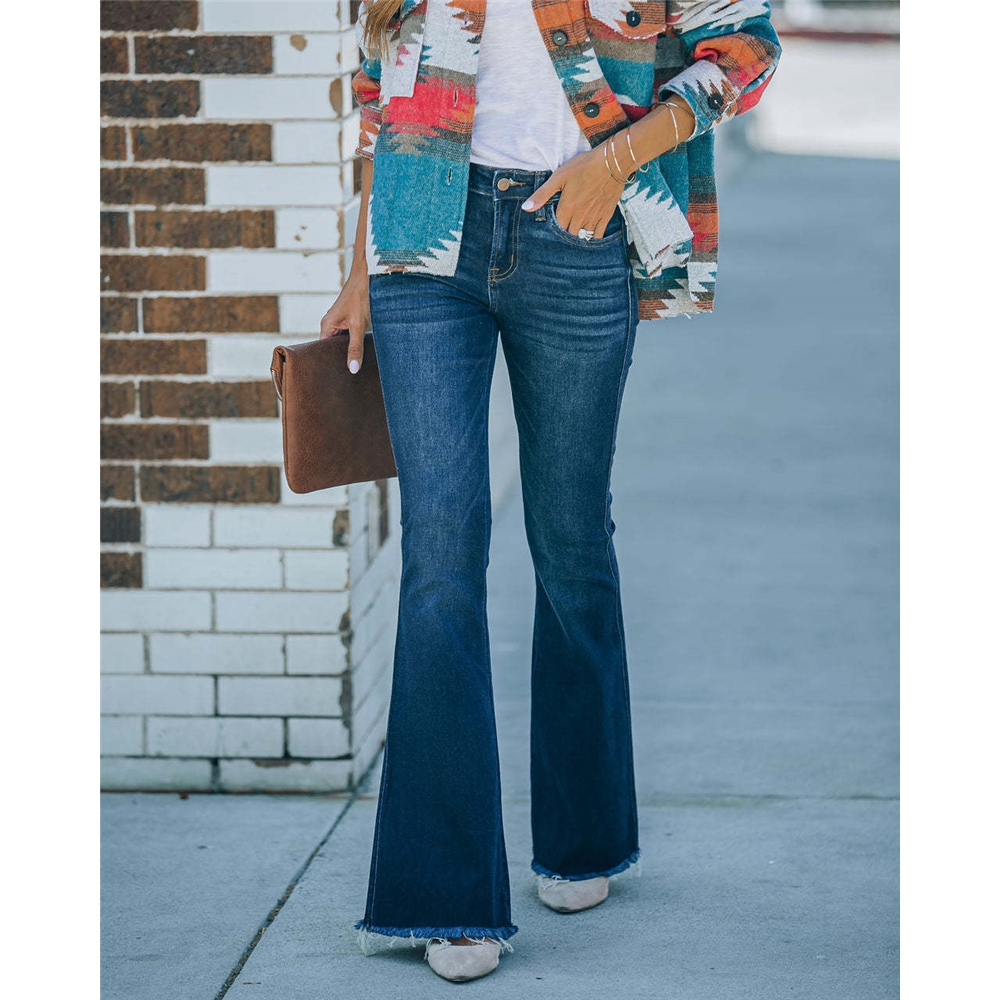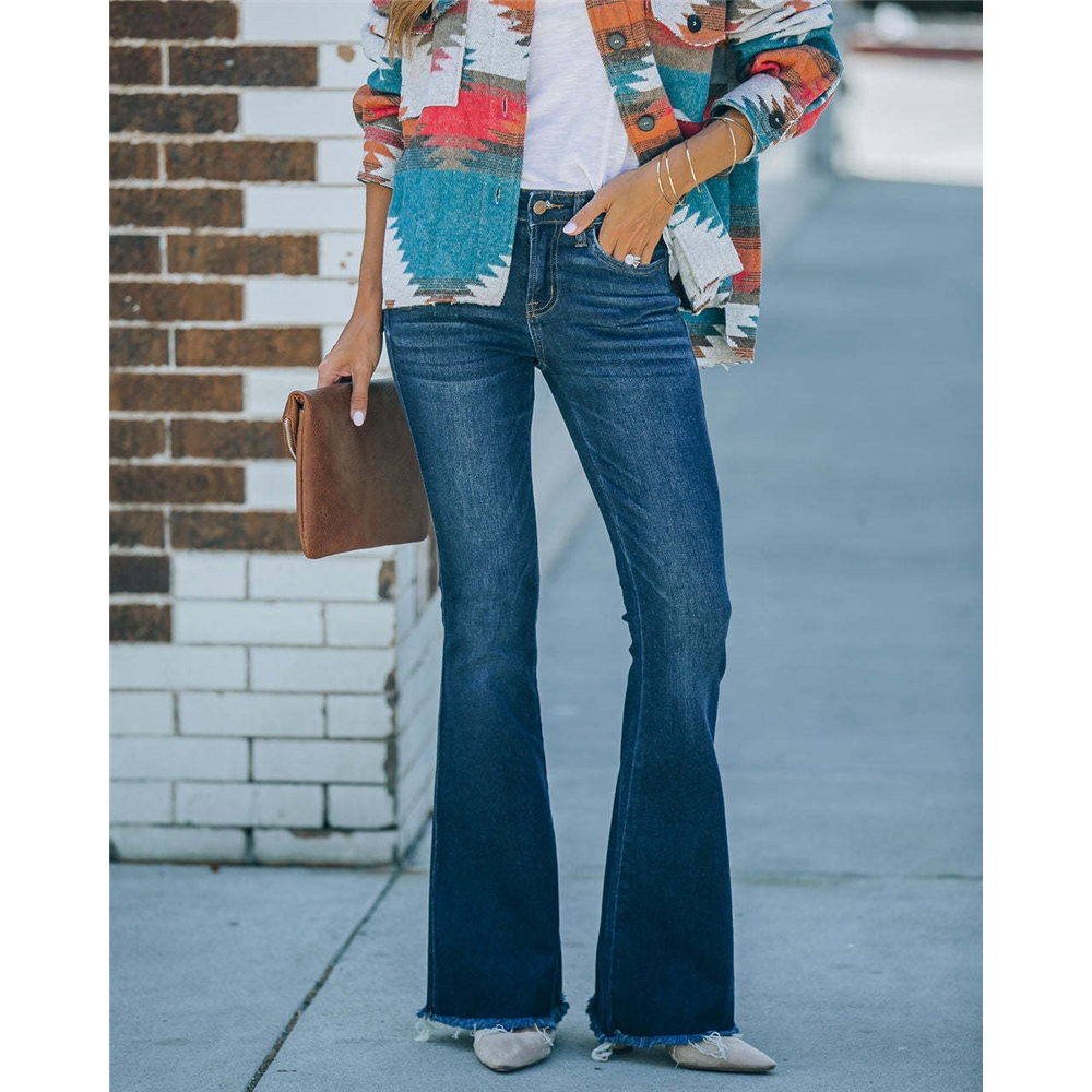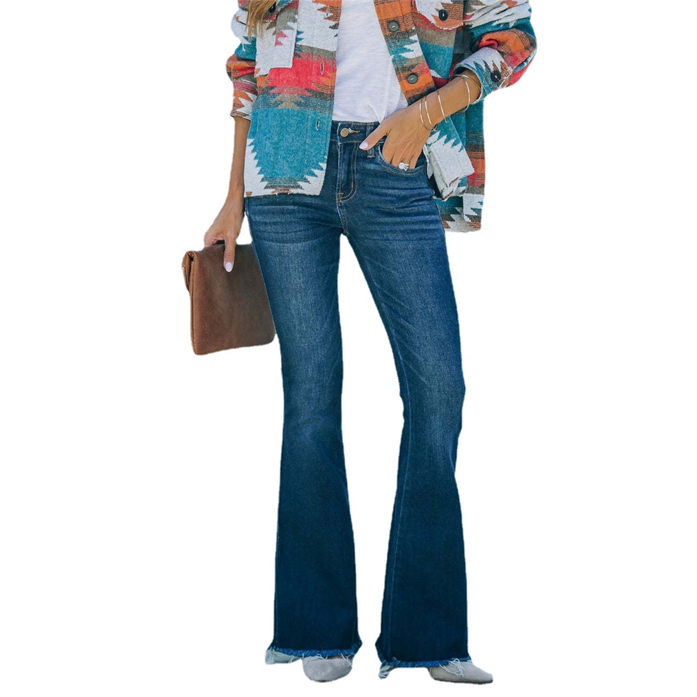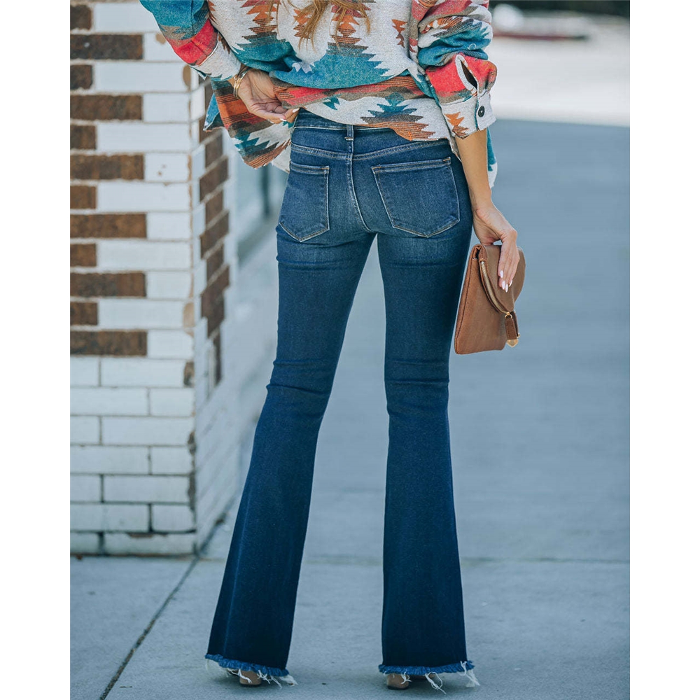 High Waisted Fringed Hem Flared Denim Pants Jeans