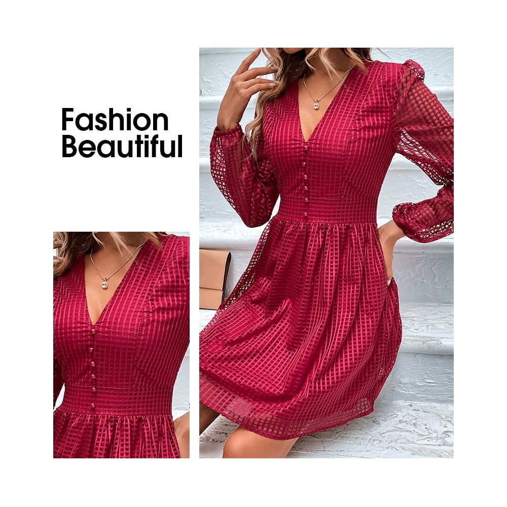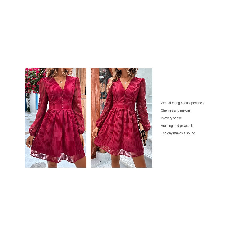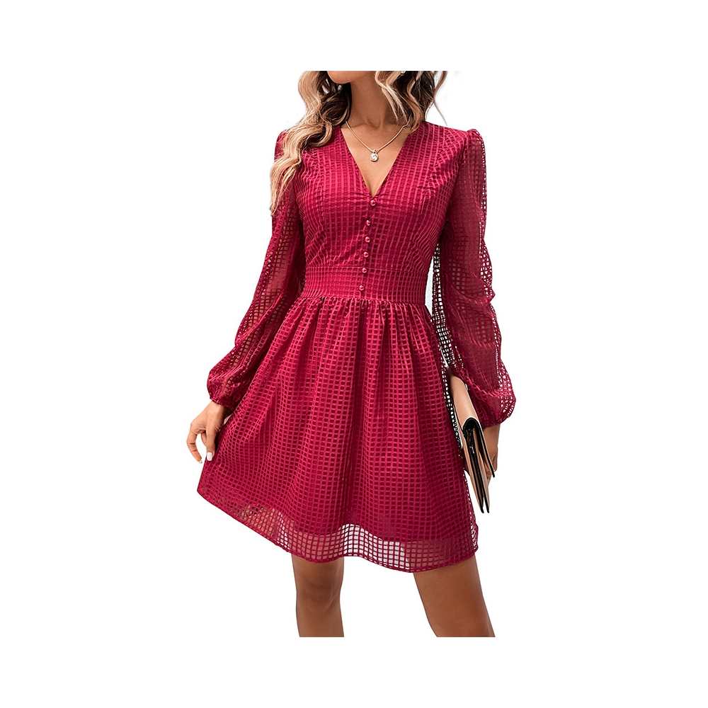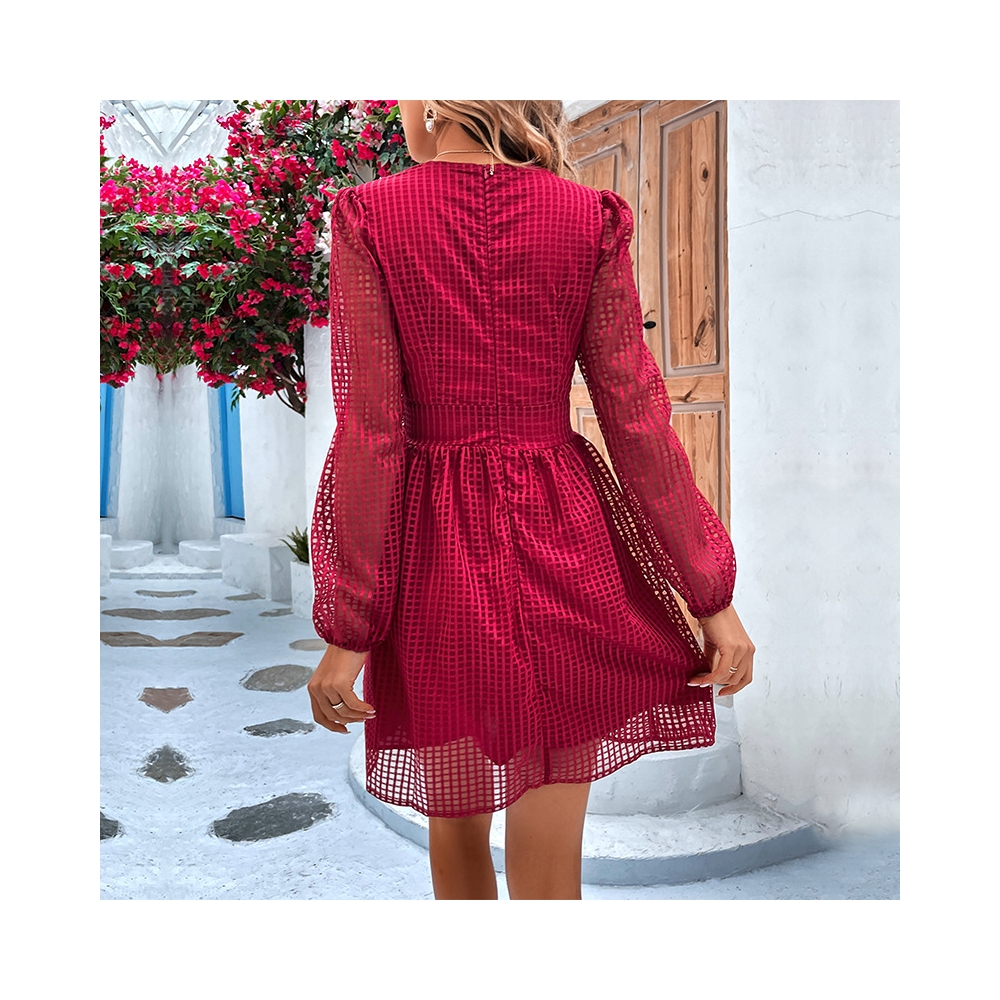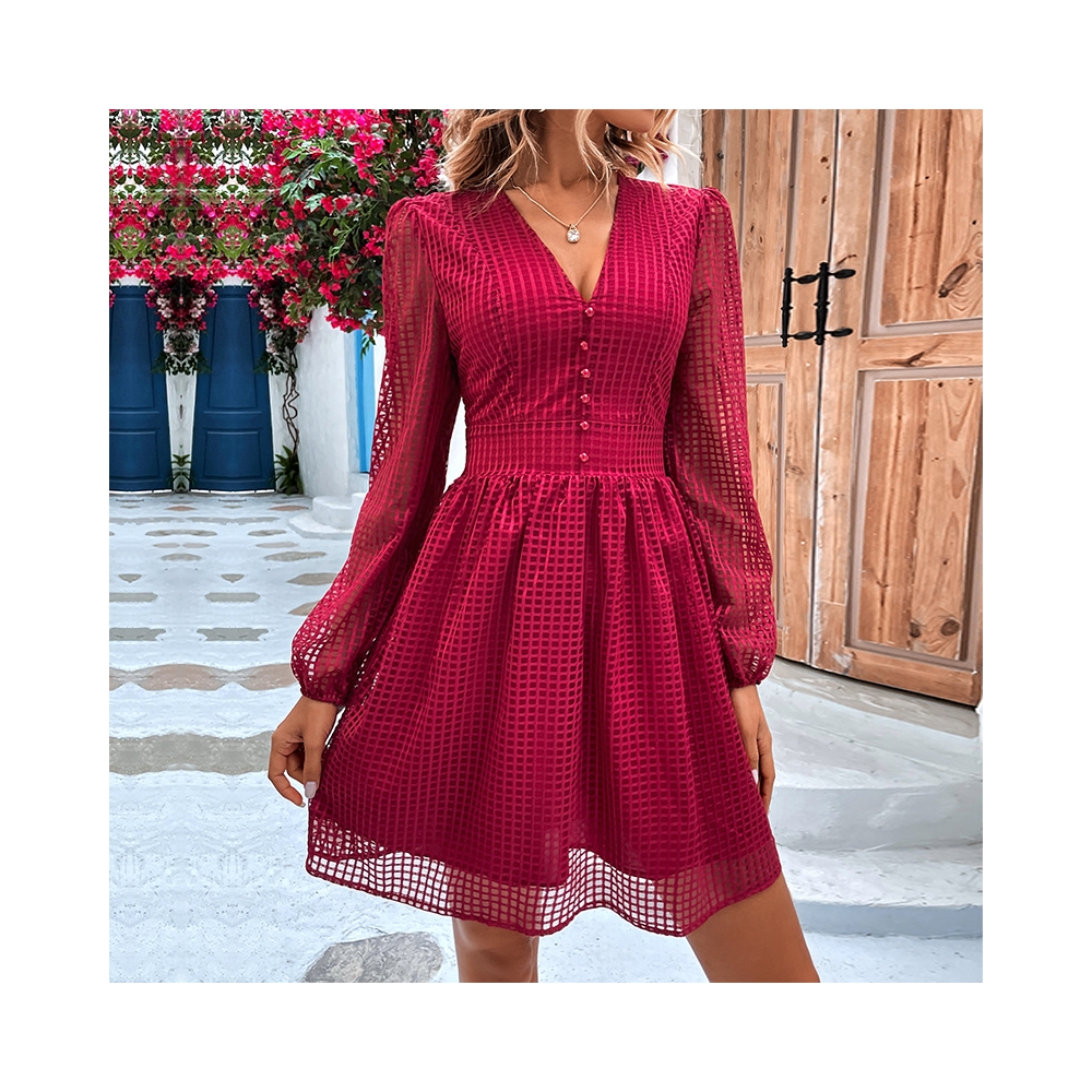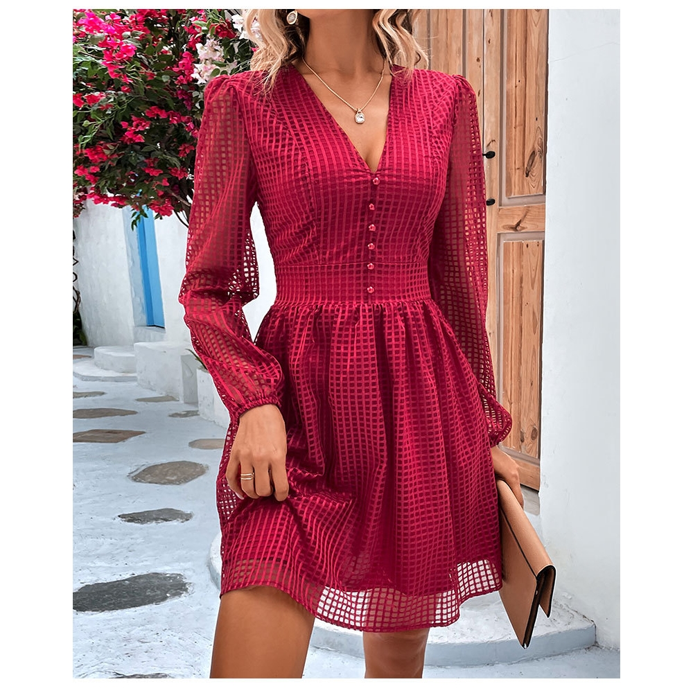 Solid Color High Waisted Long Sleeves V-Neck Mesh Dress