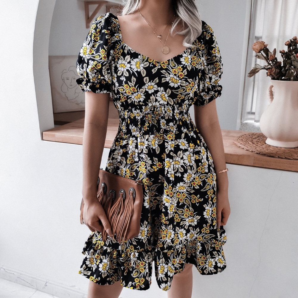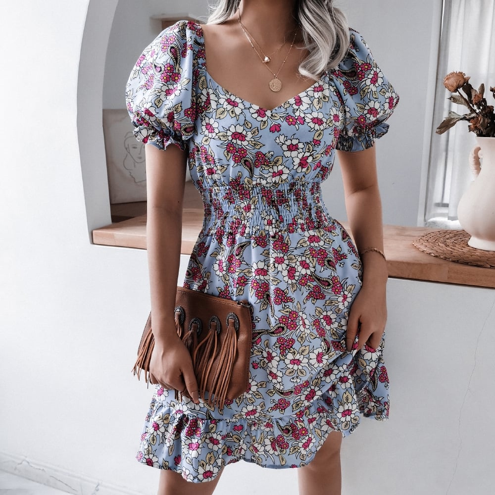 Floral Print Square Neck Puff Sleeve Mini Dress