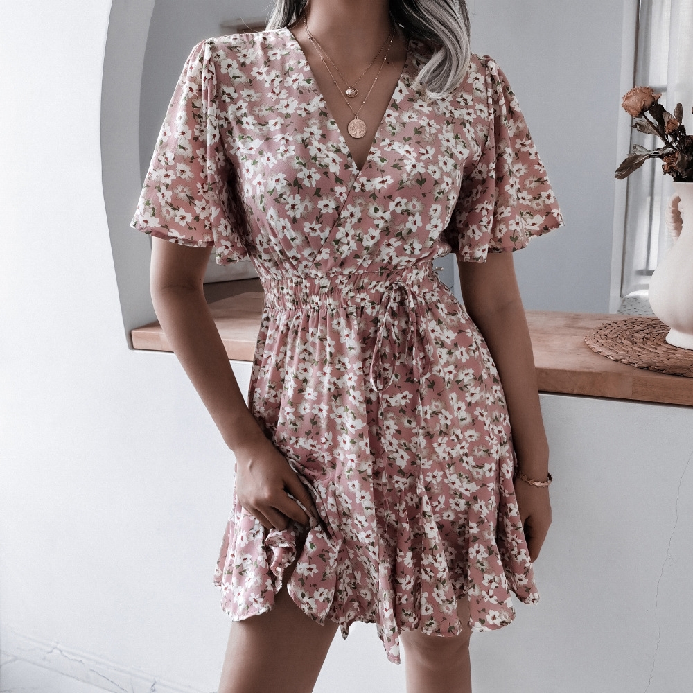 Casual Short Sleeve V-Neck Print Breathable Mini Dress