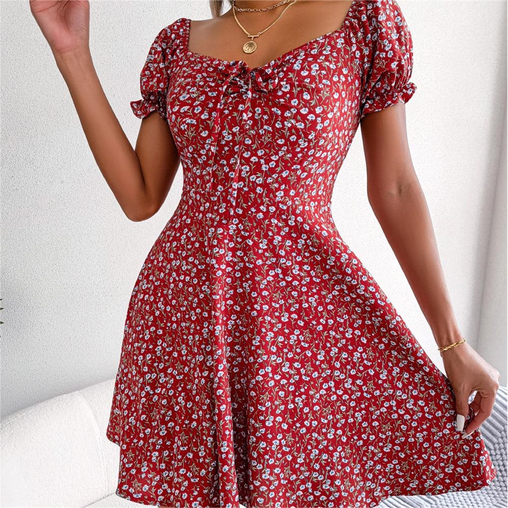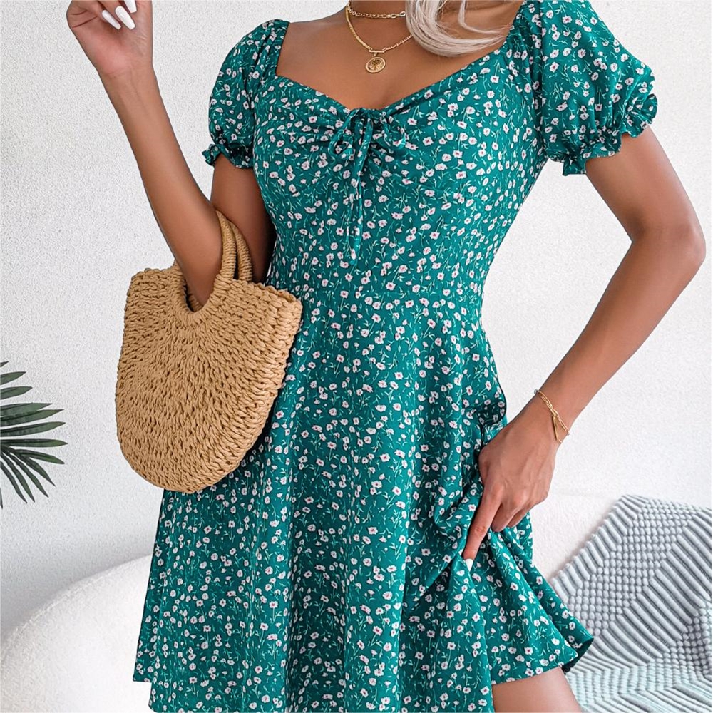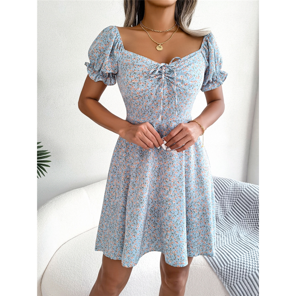 Casual Print Soft High-Waisted Puff Sleeve Mini Dress