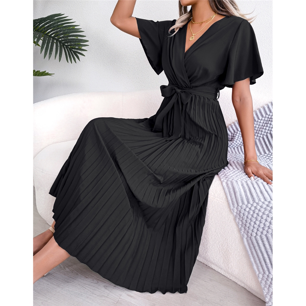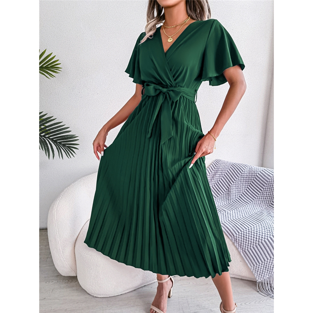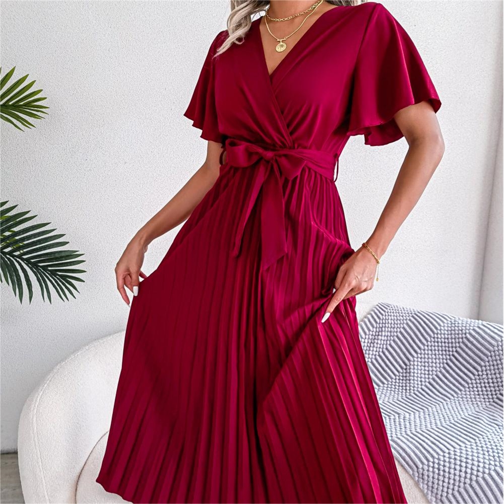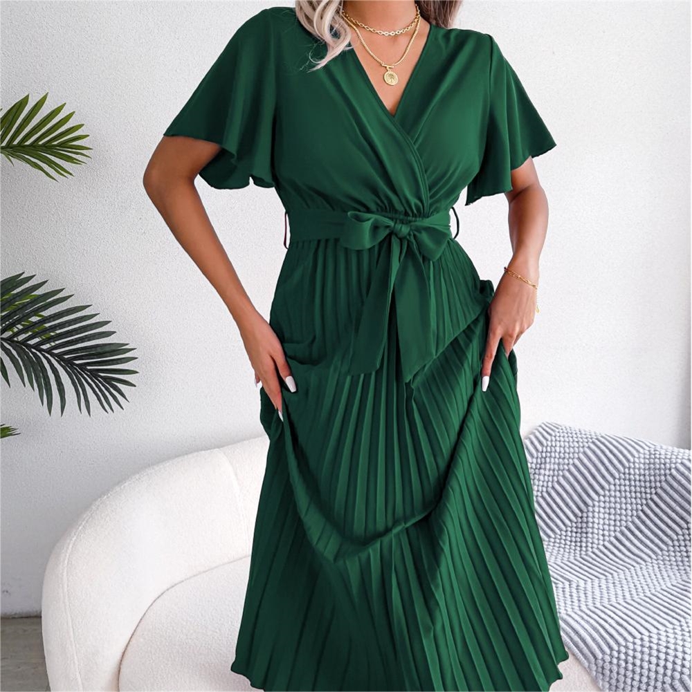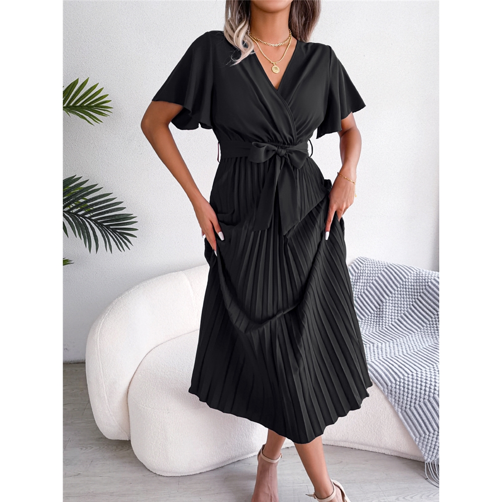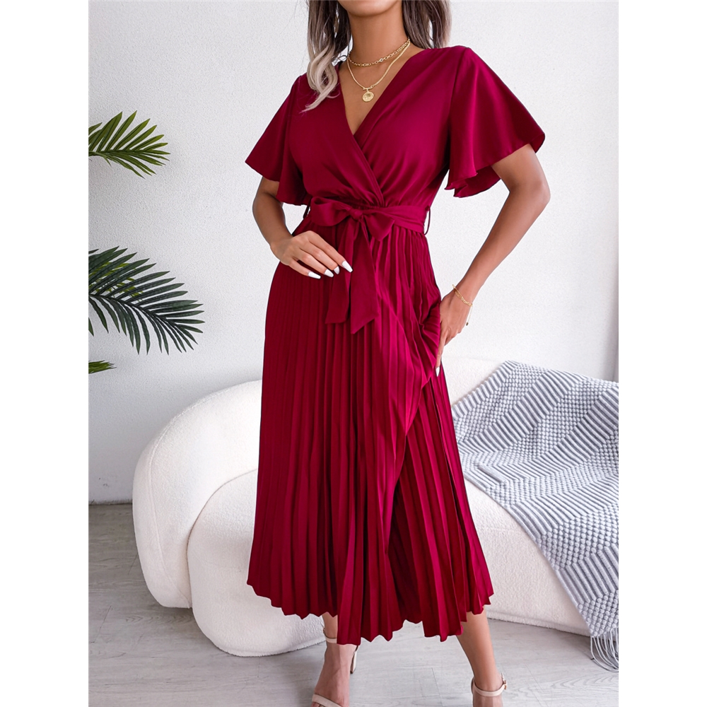 Plain V-Neck High-Waisted Bowknot Short Sleeve Maxi Dress