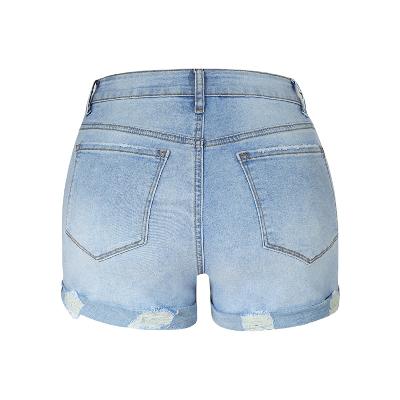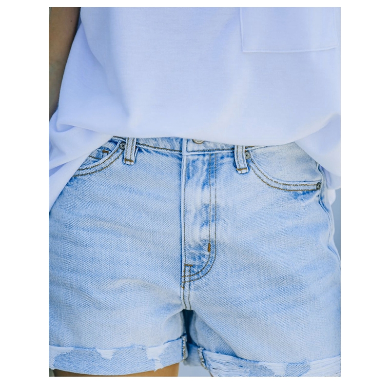 Middle Rise Straight Leg Ripped Roll Hem Stretch Denim Shorts