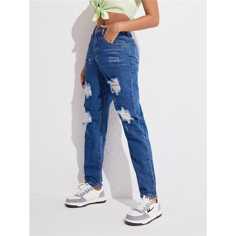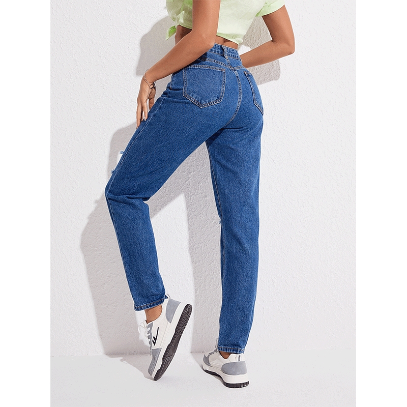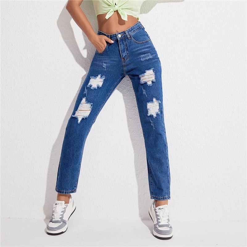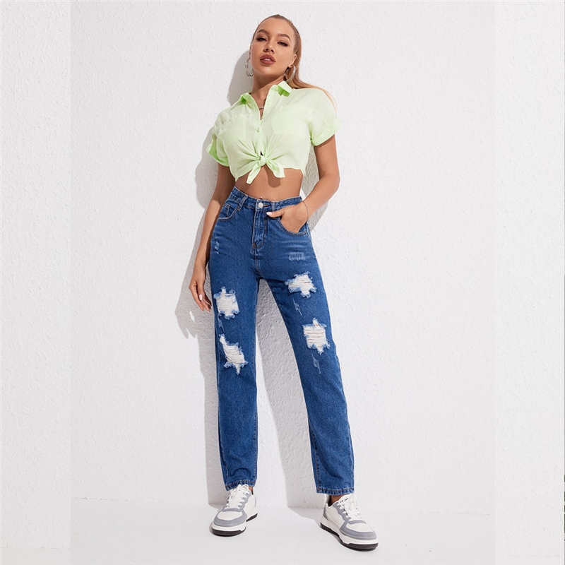 High Waisted Casual Hole Straight Leg Pants Jeans