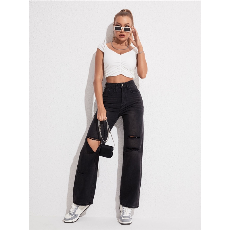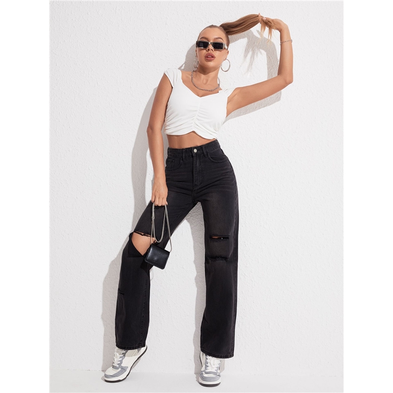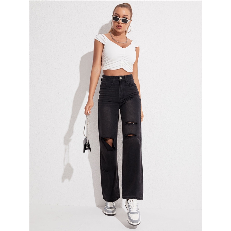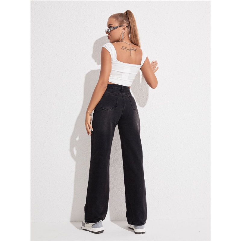 High Waisted Hole Straight Leg Casual Loose Jeans
