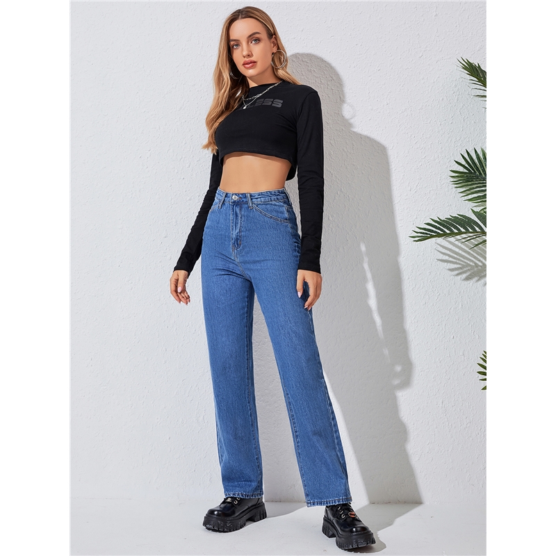 Solid Color High Waisted Straight Leg Casual Loose Jeans