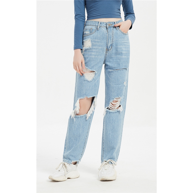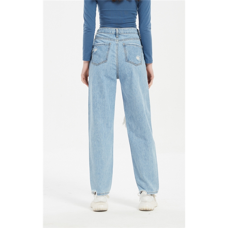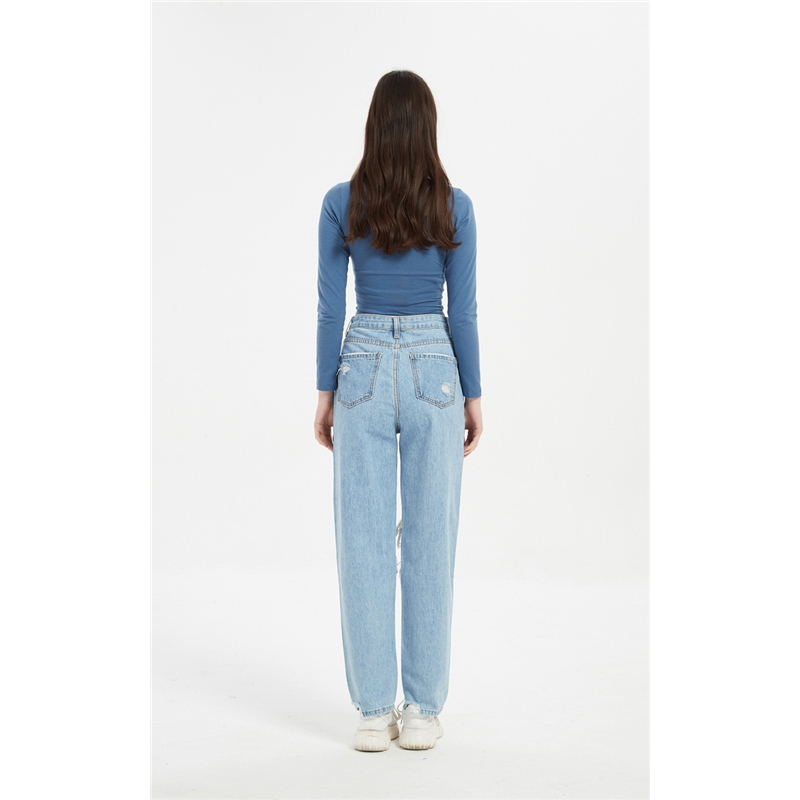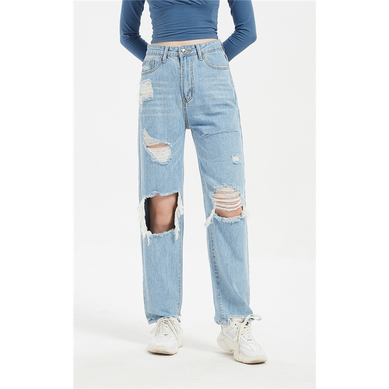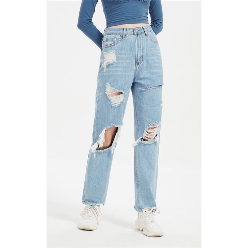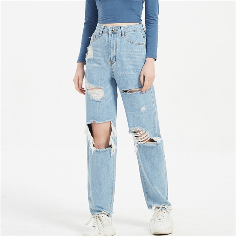 High Waisted Straight Leg Hole Simple Casual Jeans