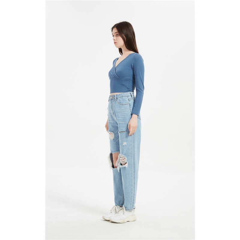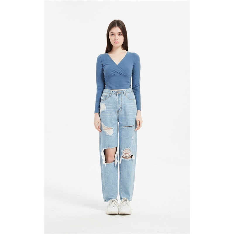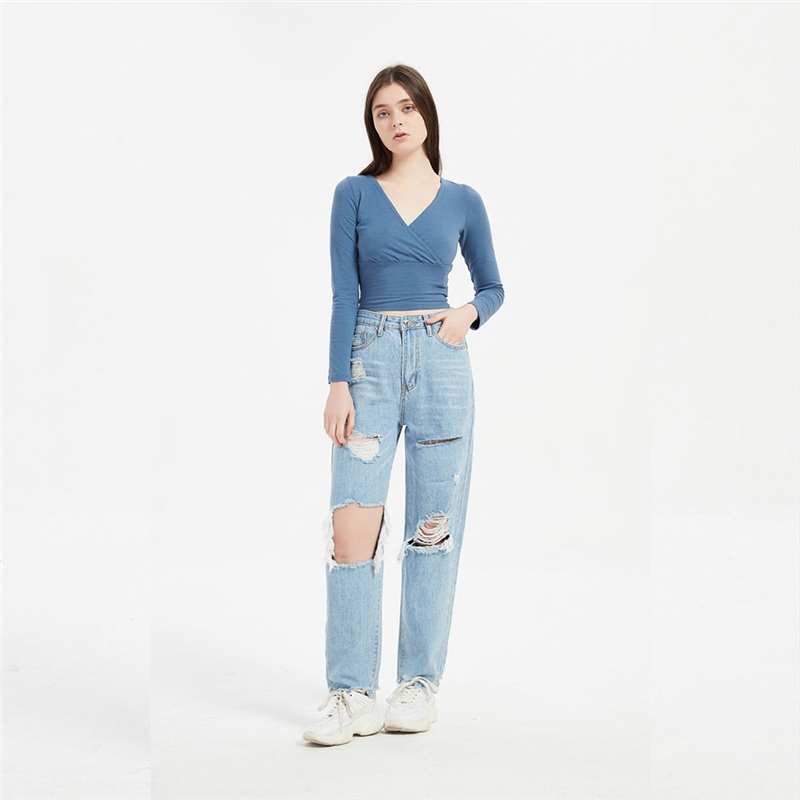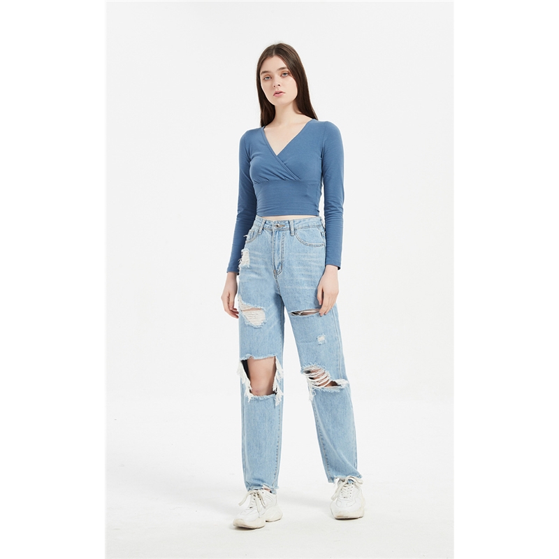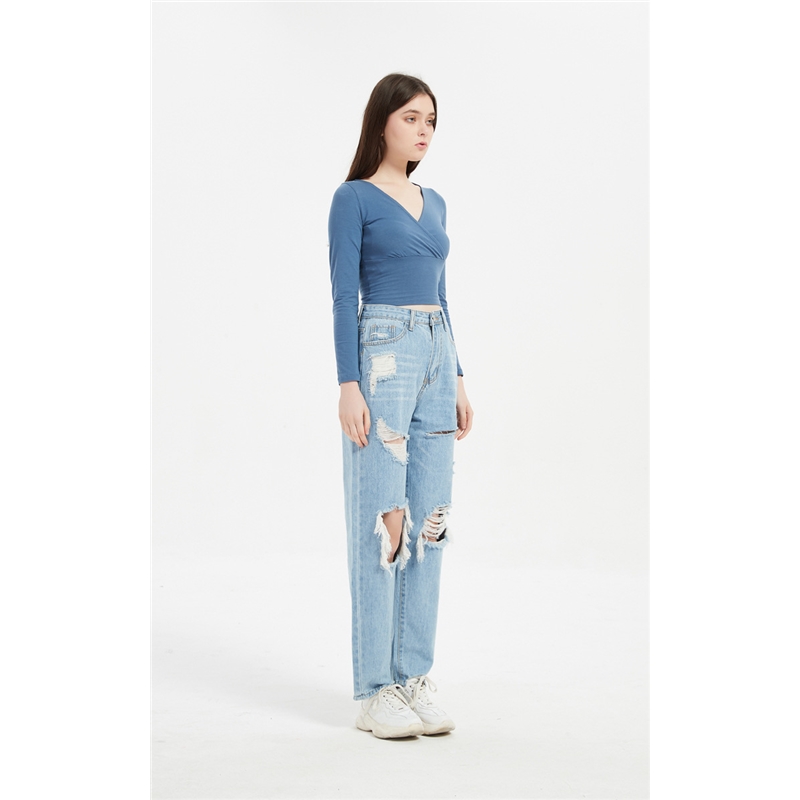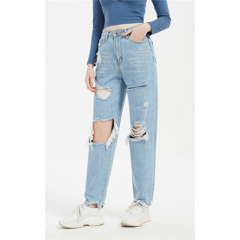 High Waisted Straight Leg Hole Simple Casual Jeans