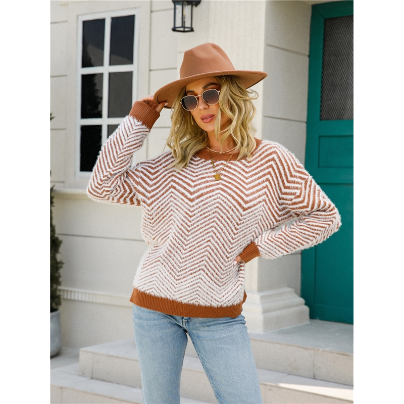 Round Neck Long Sleeves Contrast Color Pullover Sweater