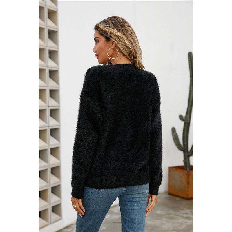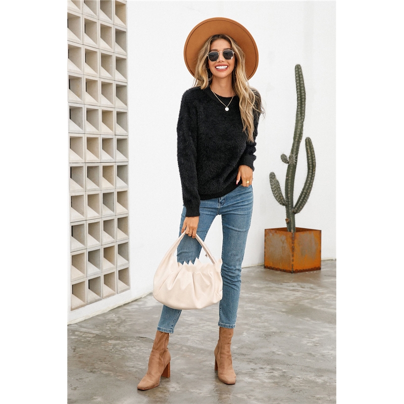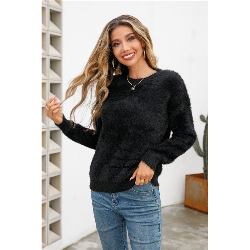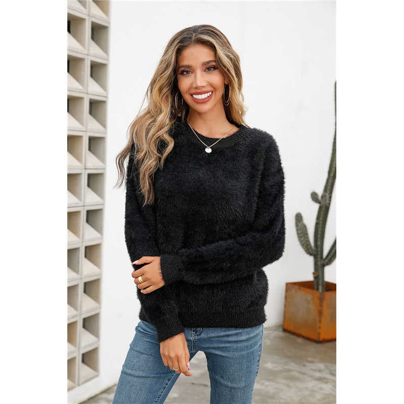 Crewneck Long Sleeves Solid Color Fluffy Knitted Sweater